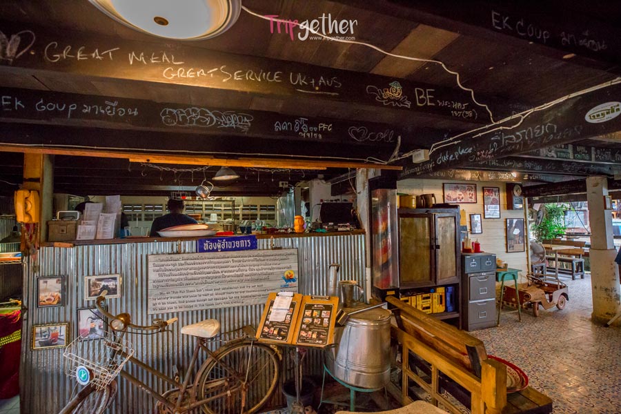เวลาเกือบเที่ยงคนจึงค่อนข้างเยอะเป็นพิเศษ เราก็ต้องรอวนไปจ้า ขอแชะรูปหน้าร้านหน่อยระหว่างรอ ร้านตกแต่งเป็นสไตส์กาแฟโบราณหน้าบ้านน่ารักดูวินเทจมากๆ