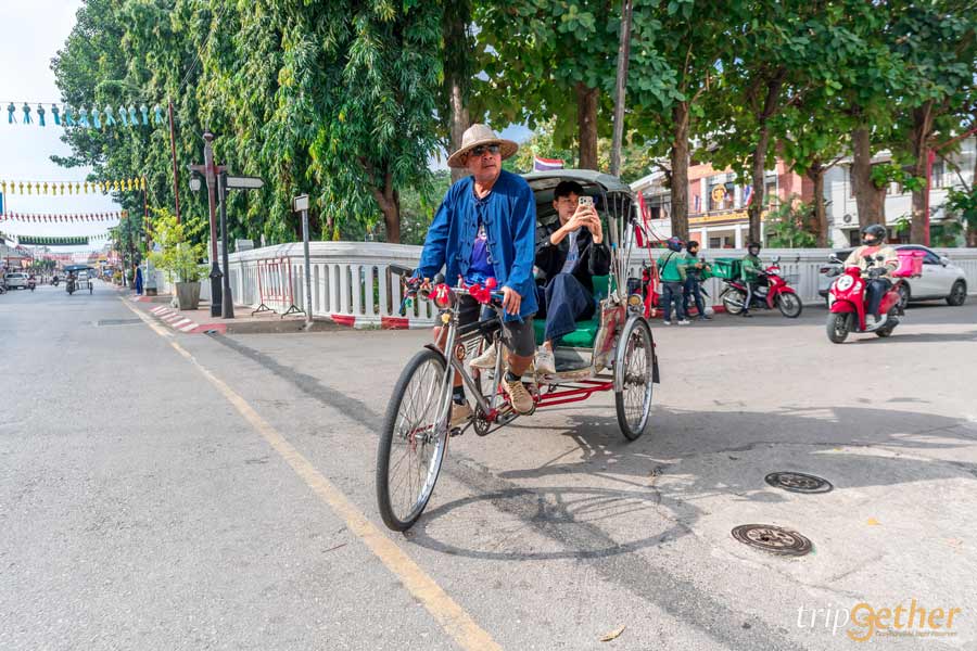 ทริปนี้เราเริ่มต้นกันตั้งแต่เช้าแบบสโลว์ไลฟ์ ด้วยกิจกรรมที่เรียกว่าเป็นเอกลักษณ์ของที่นี่เลย นั่นก็คือ นั่งสามล้อถีบลำพูน ไปตามถนนรอบคูเมือง