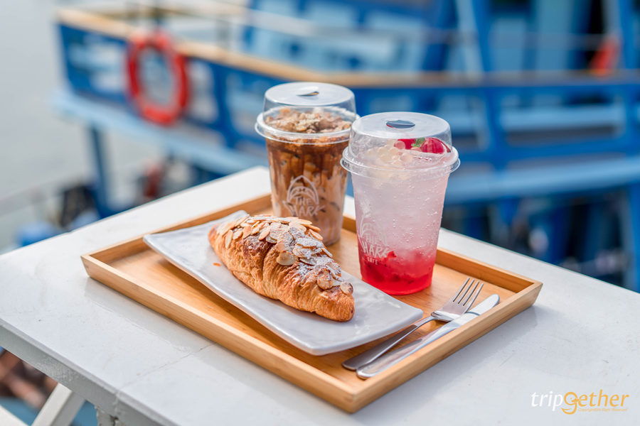 ในส่วนของเมนูแนะนำที่ไม่ควรพลาดคือ Girl Paradise สีชมพูสดใส และ Almond Caramel สำหรับสายกาแฟ เสิร์ฟคู่กับครัวซองต์อัลมอนด์หอมๆ นั่งจิบเครื่องดื่ม มองทะเล ฟังเสียงลม บอกเลยว่าชิลล์มาก