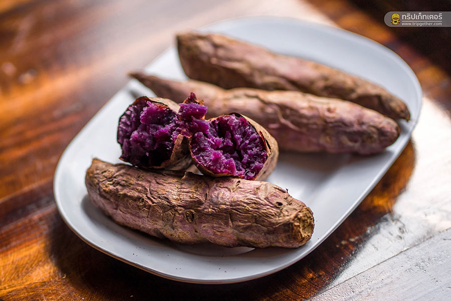 และปิดท้ายด้วยเมนูปิ้งย่างช่วยอบอุ่นคลายหนาว มันม่วงเผา ฟินเข้ากับบรรยากาศ