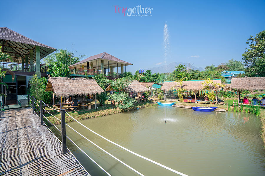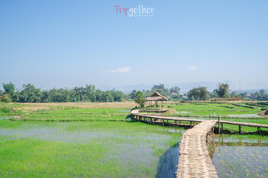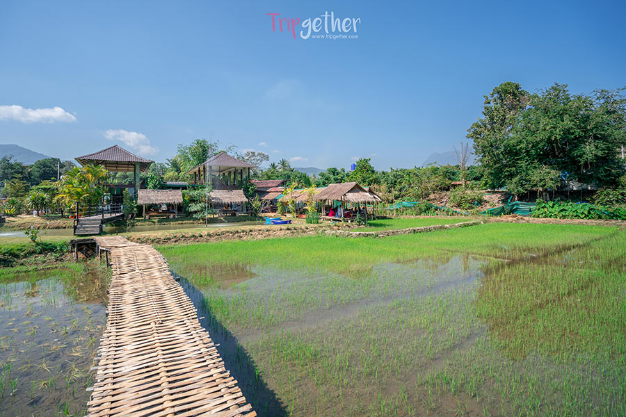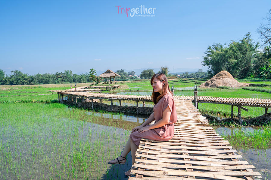 ระหว่างรออาหารที่ร้านก็มีจุดถ่ายรูปบนสะพานไม้กลางทุ่งนา หรือจะเดินไปถ่ายรูปเล่นที่กระท่อมปลายนา พร้อมเครื่องดนตรีเตหน่าให้เป็นพร้อพถ่ายรูปเก๋ๆ อีกด้วย