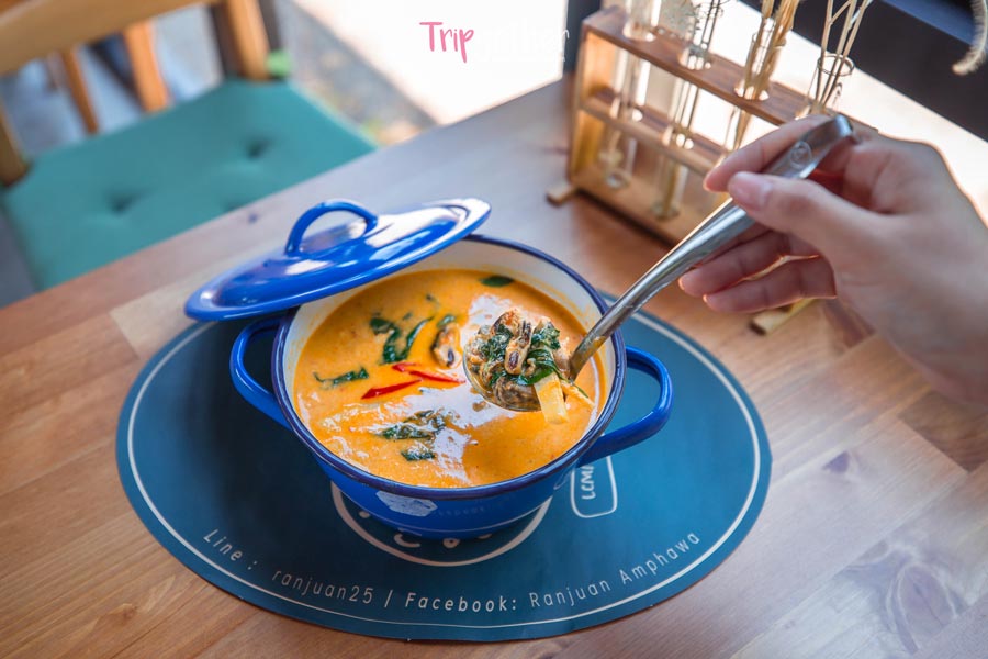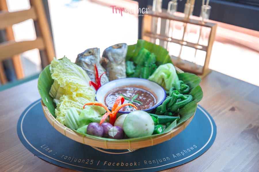 นอกจากดีไซน์และการตกแต่งจะทำให้เราได้เพลินไปกับการรัวชัตเตอร์แล้ว ที่นี่ยังเด็ดเรื่องเมนูอาหาร เพราะแต่ละเมนูก่อนเสิร์ฟถึงโต๊ะ ได้คัดสรรวัตถุดิบชั้นดี ปรุงอย่างพิถีพิถันเสมือนทำให้คนในบ้านกิน โดยมีเมนูแนะนำเป็นกุ้งแม่น้ำเผา, ข้าวแห้งเป็ด, น้ำพริกกะปิปลาทูทอด, แกงคั่วหอยแมลงภู่ยอดมะพร้าว และ ยำมะเขือยาว