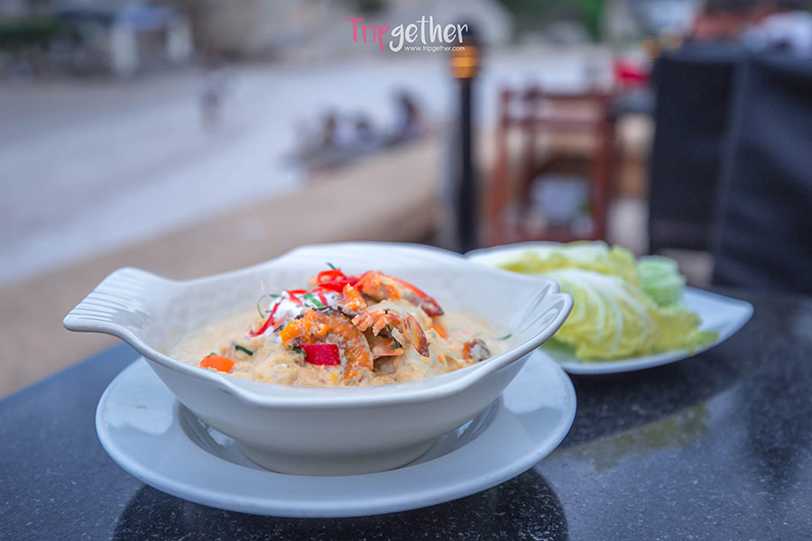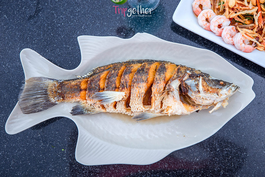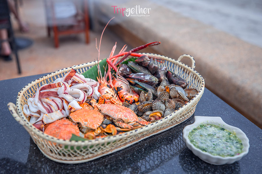 นอกจากบรรยากาศร้านจะดีแล้วที่นี่ ก็มีเมนูอาหารให้เลือกอร่อยกันอย่างมากมายโดยมีเมนูแนะนำเป็นส้มตำทอด 240 บาท, ปลากะพงทอดน้ำปลา 520 บาท, ออส่วน 300 บาท, กระจาดทะเลเผา 580 บาท, หลนปูม้า 250 บาท เมนูของหวานก็มี กล้วยหอมทอด 150 บาท และ ไอศกรีมกะทิสดในลูกมะพร้าว 110 บาท