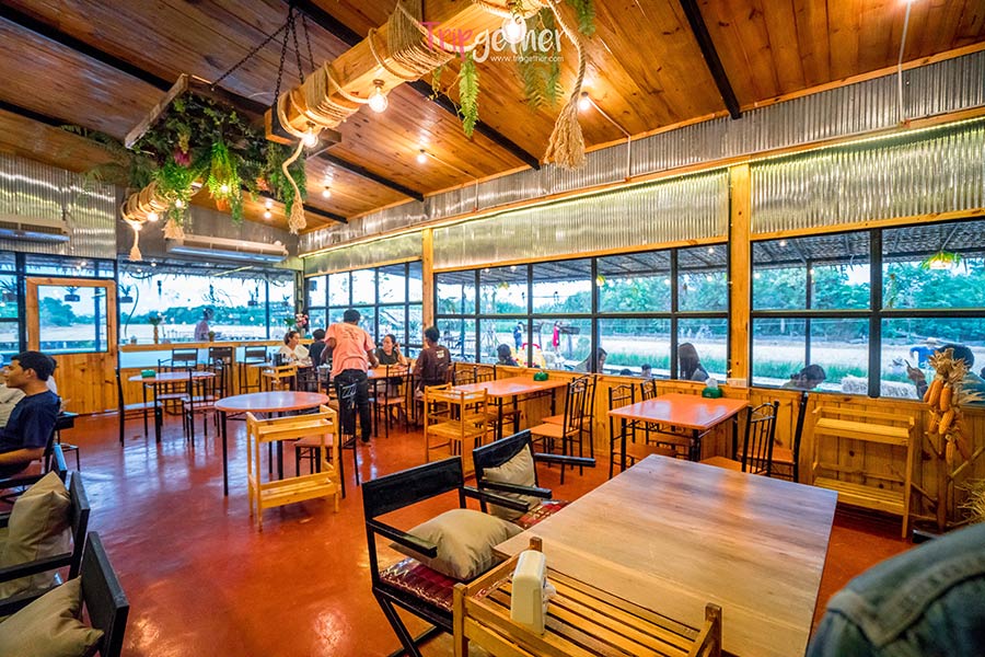 สำหรับที่นั่งภายในร้านก็มีให้เลือกทั้งแบบ Indoor และ Outdoor โดยในโซน Indoor จะเป็นห้องแอร์เย็นฉ่ำ ที่คุณสามารถนั่งกินข้าวพร้อมชมวิวสระมรกตได้ผ่านกระจกบานใหญ่