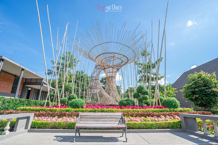 ด้านหน้าทางเข้าตกแต่งด้วยงานไม้ และสวนดอกไม้ที่มาพร้อมกับจุดถ่ายรูปสุดเก๋