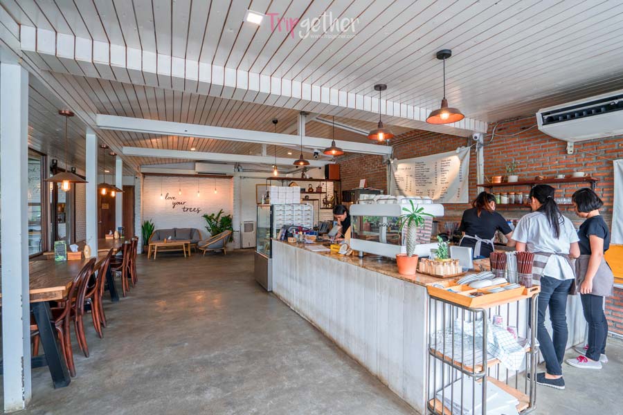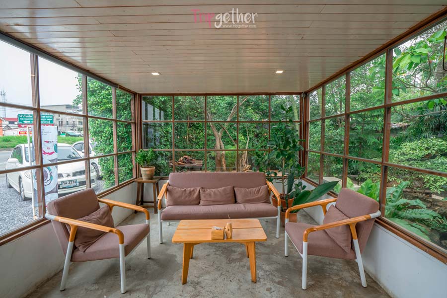 ภายในร้านก็ตกแต่งด้วยสีที่สีขาวและน้ำตาลอ่อน ให้ความรู้สึกอบอุ่นสบายๆ เหมือนนั่งที่สวนเลยทีเดียวยิ่งได้กลิ่นกาแฟหอมๆ เป็นอะไรที่ดีและผ่อนคลายสุดๆ โดยที่ร้านมี 2 โซนคือโซนด้านในเป็นห้องแอร์ แต่ก็สามารถมองไปยังสวนด้านหลังร้านได้ โดยรอบร้านใช้กระจกเป็นตัวกั้นทำให้ดูโล่งสบาย คล้ายเรือนกระจกเพาะชำพืชในหนังเลย