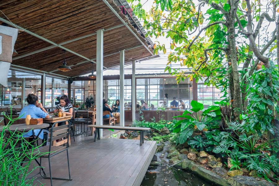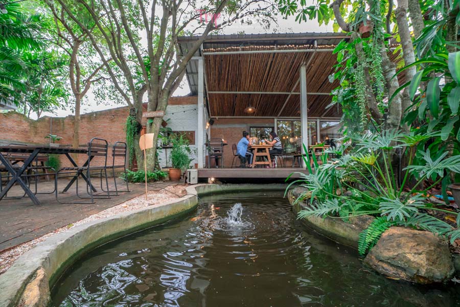 โซนด้านนอกถูกตกแต่งในเป็นสวนต้นไม้ และยังมีบ่อปลาคราฟด้วยนะ ใครที่ชอบนั่งจิบกาฟหรือกินอาหารอร่อยๆ ในบรรยากาศสบาย ต้องไม่พลาดโซนนี้ มุมถ่ายรูปก็เยอะแยะให้เลือกถ่ายได้เพลินๆ ประหนึ่งเป็นสายฮิปเตอร์ตัวพ่อตัวแม่ได้เลยนะ