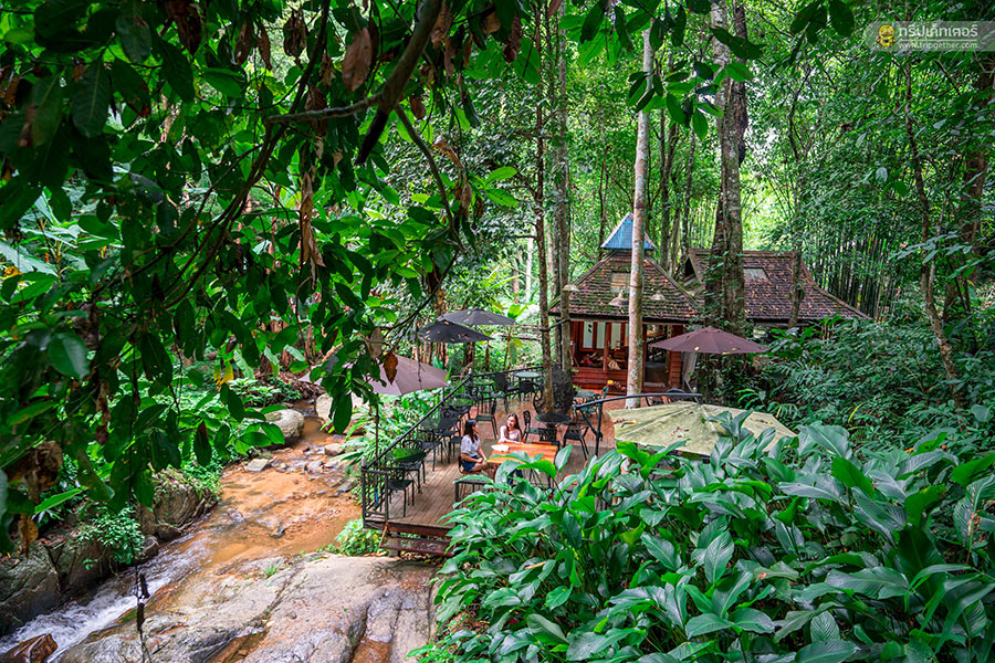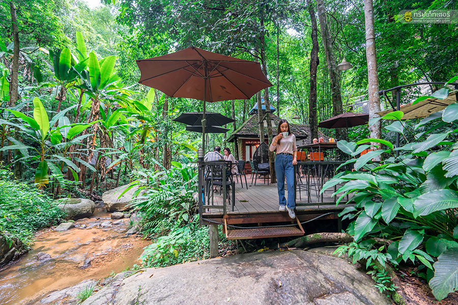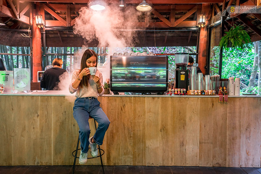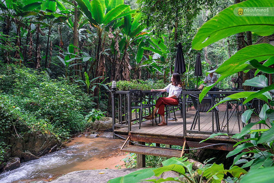 ส่วนโซน Outdoor มุมยอดฮิตของร้านที่นั่งอยู่บนเทอเรสกว้างที่ยื่นไปริมลำธารให้คุณได้นั่งจิบกาแฟ หรือจะลงเอาเท้าจุ่มน้ำให้ชื่นใจก็ได้ฟีลการพักผ่อนไปอีกแบบ