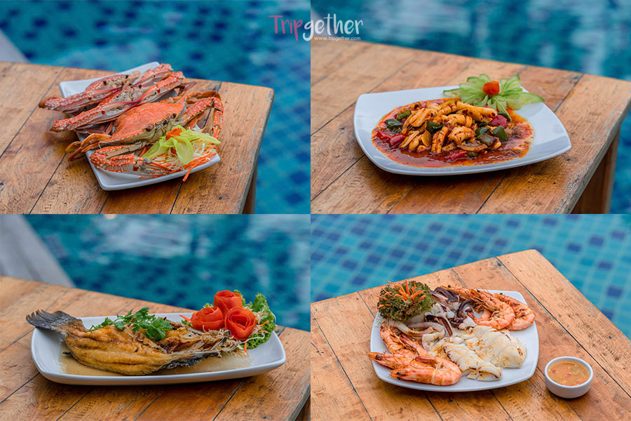 จัดเต็มความอร่อยๆ ด้วยเมนูจากทางรีสอร์ท มีทั้ง ปิ้งย่างซีฟู้ด กุ้งเนื้อแน่นและปลาหมึกสดๆ จากทะเลเกาะกูด ปูม้านึ่ง พร้อมน้ำจิ้มซีฟู้ดสุดแซ่บ ปลาหมึกผัดน้ำผักพริกเผา และต้มยำทะเล