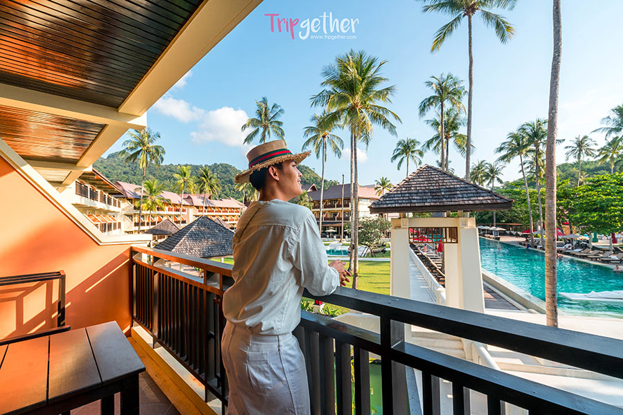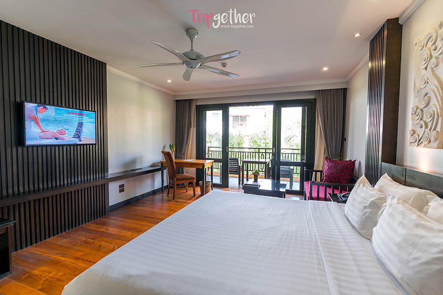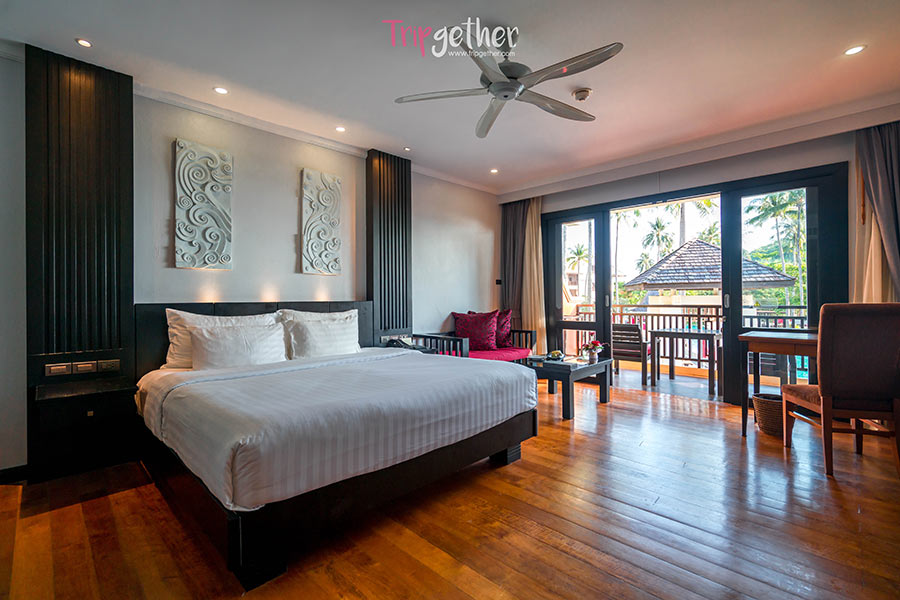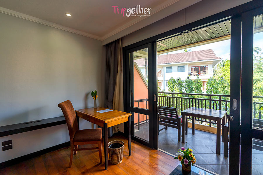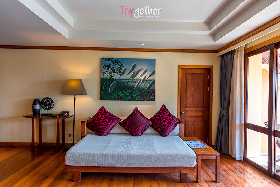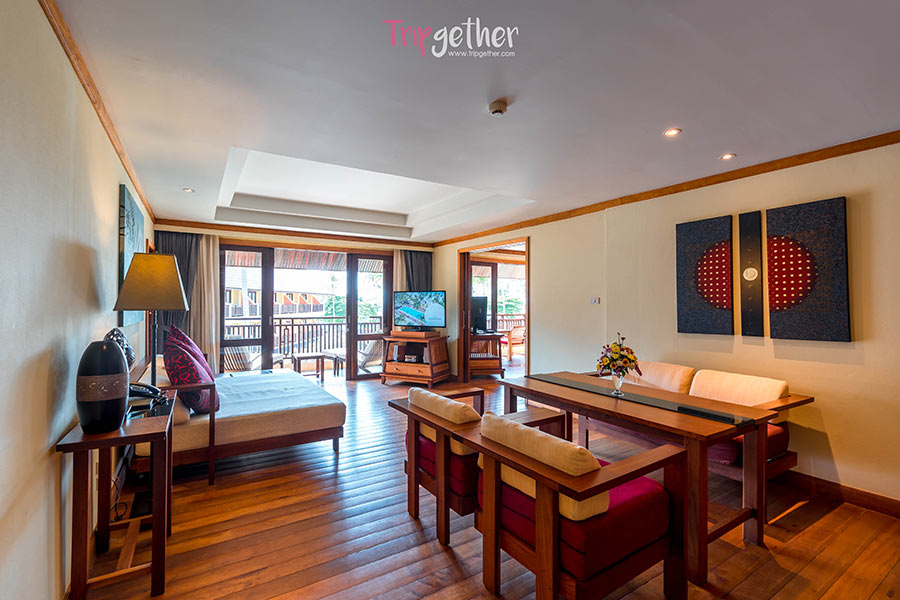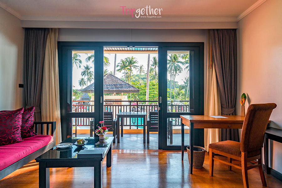 อีกทั้งภายในห้องพักยังเพียบพร้อมด้วยสิ่งอำนวยความสะดวก มีมุมโซฟาให้คุณได้นั่งพักพร้อมชมวิวสระว่ายน้ำได้จากในห้องพัก หรือถ้าใครมีงานที่ค้างคาก็มีโต๊ะทำงานวิวสวย ให้คุณได้นั่งปั่นงานท่ามกลางบรรยากาศรีแลกซ์จนลืมความเครียดได้อย่างแน่นอน