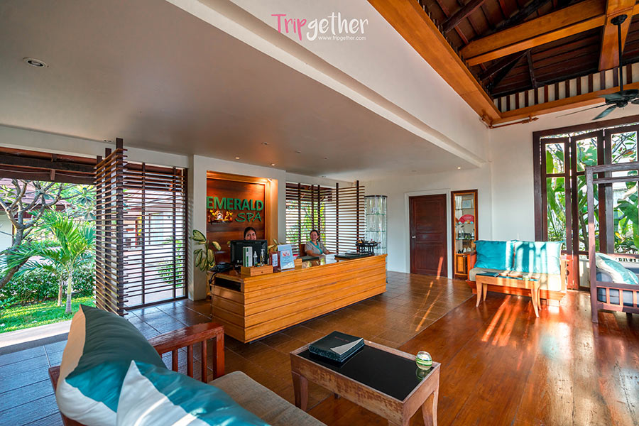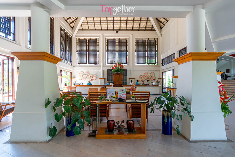 บริเวณด้านหน้ารีสอร์ทโดดเด่นด้วยอาคารสไตล์โคโลเนียลสีขาว ซึ่งเป็นล็อบบี้จุดต้อนรับและเช็คอินเข้าห้องพักนั่นเอง เมื่อคุณก้าวเข้ามาถึงบริเวณพื้นที่ของรีสอร์ทจะมีพนักงานคอยอำนวยความสะดวก ช่วยถือสัมภาระ และยังมีบริการ Welcome Drink ด้วยเครื่องดื่มสมุนไพรชื่นใจให้คุณได้ดื่มดับร้อนยามบ่ายกันอีกด้วย