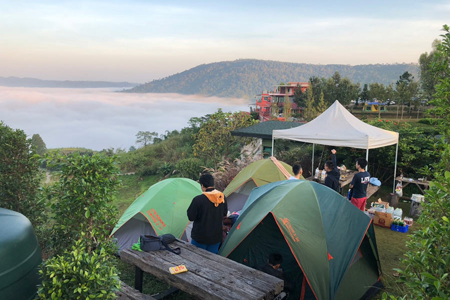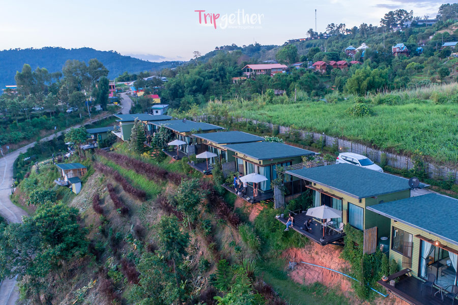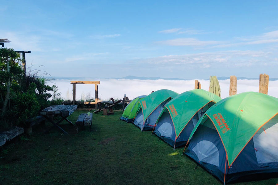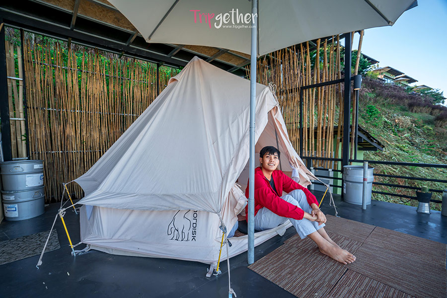 หรือถ้าใครอยากประหยัดค่าที่พัก นอนหลักร้อย วิวหลักล้านแบบชิลล์ๆ ที่นี่ก็มี เต็นท์โดม ที่กางบนสนามหญ้าถัดจากห้องอาหารเช้าลงมานิดเดียว มีเต็นท์แบบนอน 1-3 คน เป็นห้องน้ำรวม โดยราคาจะคิดเป็นคน คนละ 700 บาท รวมอาหารเช้า