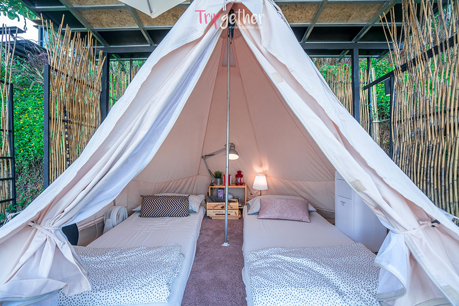 และบ้านพักหลังสุดท้าย เต็นท์กระโจมสีขาว (เต็นท์หรูแพรวพราว) ที่เอาใจคนรักธรรมชาติด้วยเต็นท์กระโจมสีขาว (เต็นท์หมี) สุดหรูที่เพียบพร้อมด้วยสิ่งอำนวยความสะดวกอย่างดี มีที่นอนนุ่มๆ มีเครื่องปรับอากาศ และห้องน้ำส่วนตัว ที่จะทำให้การนอนเต็นท์ครั้งนี้สะดวกสบายน่านอนกว่าทุกๆ ครั้งที่ผ่านมาอย่างแน่นอน โดยเต็นท์หรูแพรวพราวจะมีทั้งหมด 5 หลัง สามารถพักได้ทั้งแบบ 2 คน และแบบ 4 คน