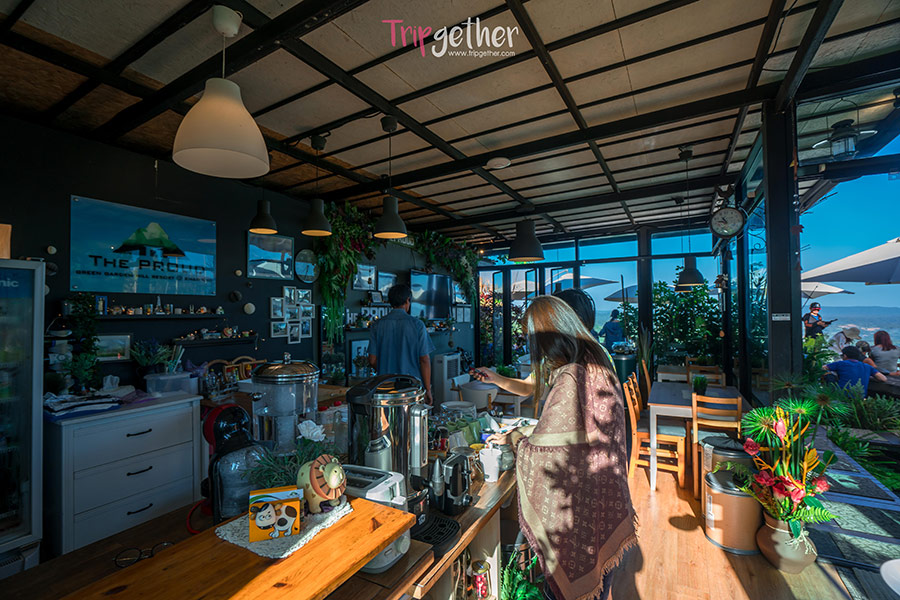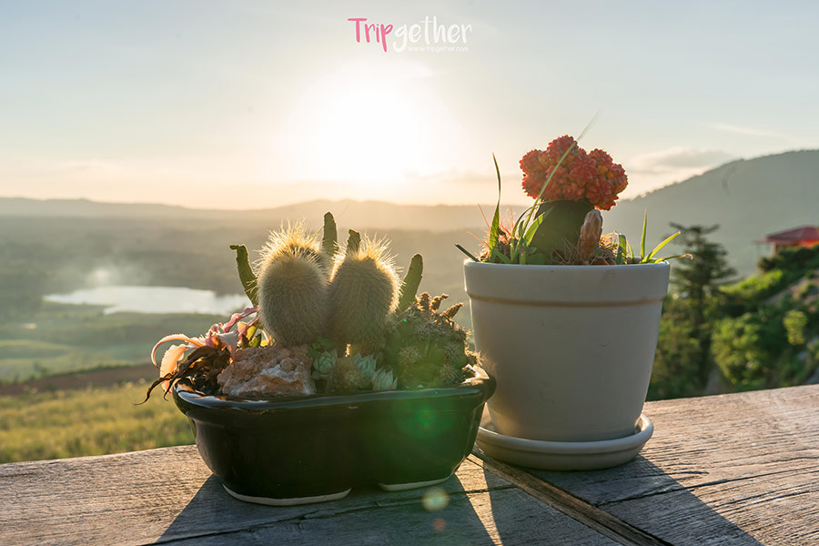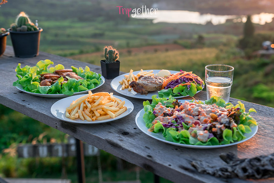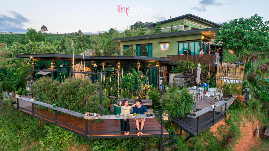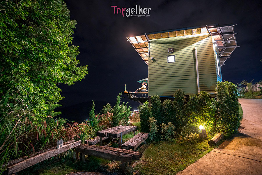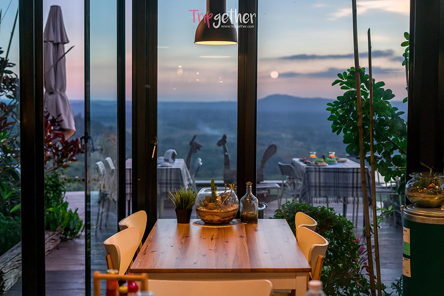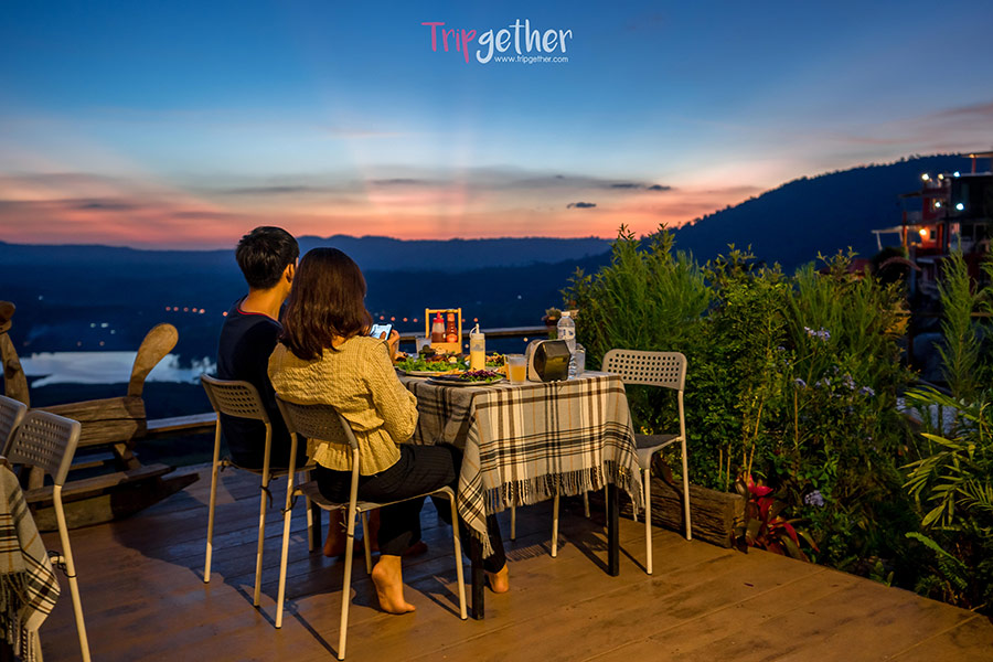 ส่วนมุมไฮไลท์ของที่นี่จะเป็นมุมเทอเรสที่คุณสามารถมานั่งรับประทานอาหารพร้อมชมวิวพระอาทิตย์ตกลับเหลี่ยมภูเขาได้อย่างสวยงาม