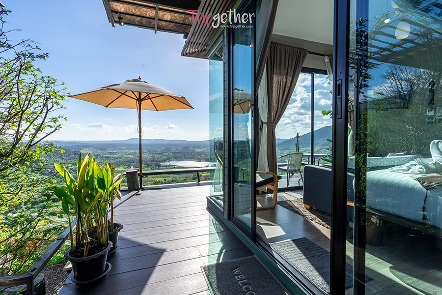 เริ่มต้นกันที่ บ้านพราววิลล่า โซน Top View บ้านพักด้านบนริมเนินเขาที่ตั้งเรียงเป็นแนวยาว มีทั้งหมด 6 หลัง (ห้อง 2-7) ทุกห้องถูกออกแบบให้ชมวิวได้อย่างเป็นส่วนตัวในมุมมองพาโนราม่า เห็นวิวอ่างเก็บน้ำรัตนัย และทิวเขาที่สลับซับซ้อนกันอย่างสวยงาม