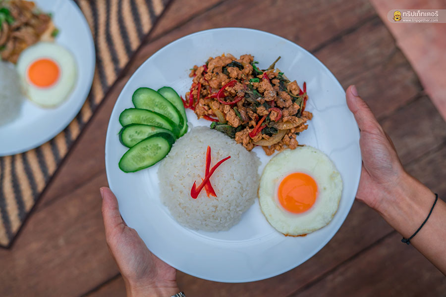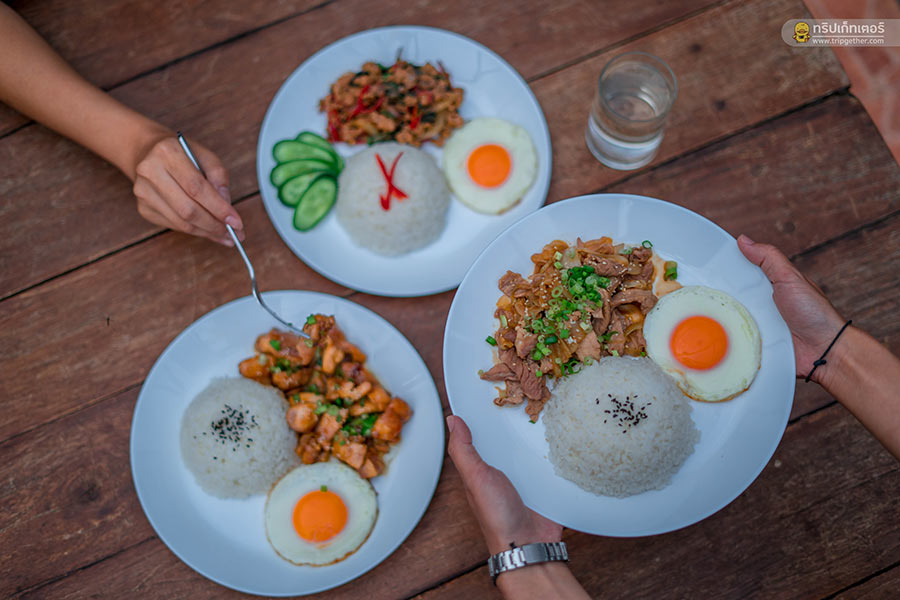 สำหรับอาหารการกินที่นี่ หากต้องการรับประทานอาหารเย็นในที่พักสามารถแจ้งได้ตอนเช็คอินได้เลย สั่งอาหารได้ถึง 19.00 น. โดยจะเสิร์ฟเป็นเมนูง่ายๆ เมนูในแต่ละวันจะขึ้นอยู่กับวัตถุดิบที่มี อย่างวันนี้จะมี ข้าวกะเพราไข่ดาว ข้าวไก่เทอริยากิไข่ดาว และข้าวผัดหมูสไตล์เกาหลี หรือถ้าใครอยากเปลี่ยนบรรยากาศ กินอาหารพื้นเมืองก็เข้าไปยังกลางหมู่บ้านแม่กำปองได้เช่นกัน มีหลายร้านให้เลือก ซึ่งจากที่พักไปยังกลางหมู่บ้านแม่กำปองใช้เวลาเดินประมาณ 5 นาทีเท่านั้น