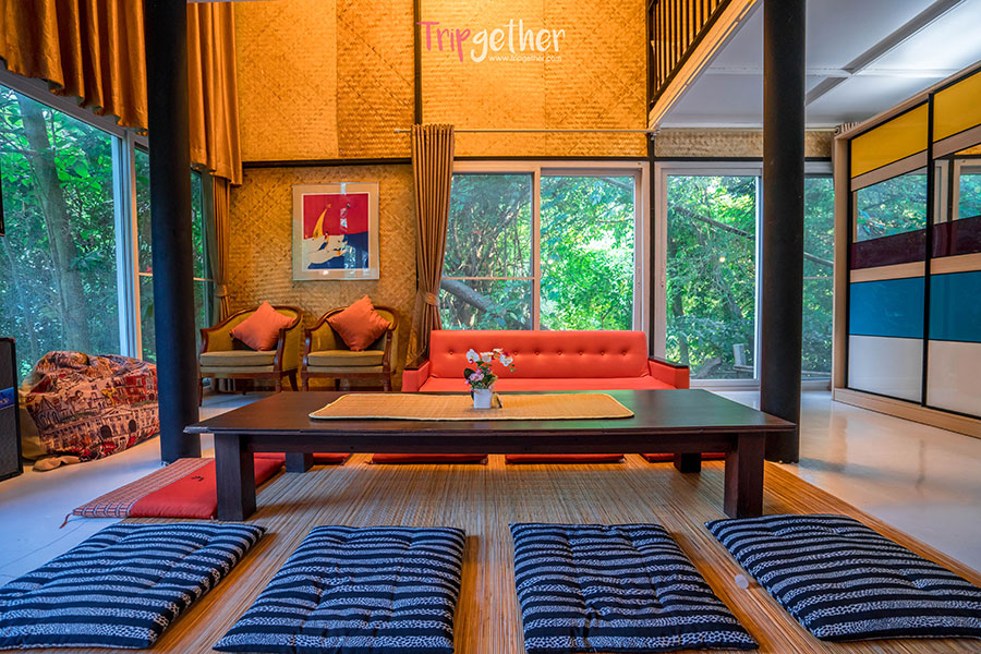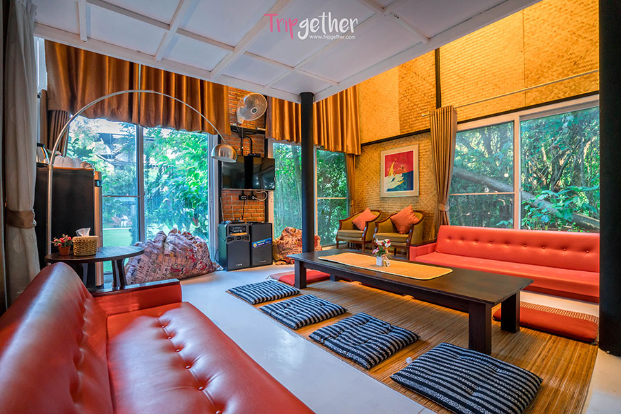 ภายในที่พักแบ่งเป็น 2 ชั้น โดยชั้นล่างจะเป็นห้องนั่งเล่นขนาดกว้างขวาง มีคาราโอเกะให้คุณได้สนุกกันแบบจัดเต็ม ส่วนบริเวณด้านนอกก็มีระเบียงส่วนตัวให้นั่งเล่น หรือถ้าใครอยากจะปาร์ตี้บาบีคิวก็สามารถทำได้เช่นกัน ทางที่พักมีเตาพร้อมถ่านให้เช่าในราคาชุดละ 300 บาท