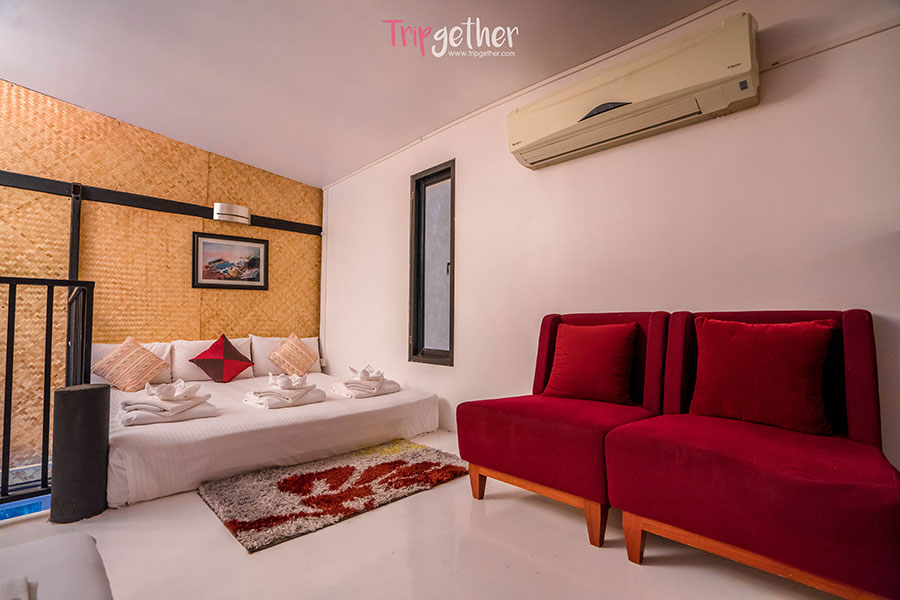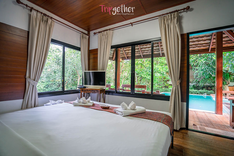 ส่วนภายในห้องพักตกแต่งและออกแบบในสไตล์ไทยประยุกต์ มีสิ่งอำนวยความสะดวกที่ครบครัน สามารถพักได้ถึง 3 คน และที่สำคัญจากห้องพักเพียงไม่กี่ก้าวก็สามารถเดินลงสระได้เลย