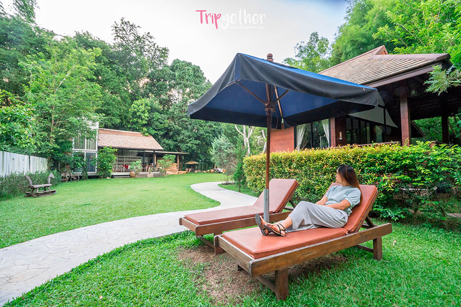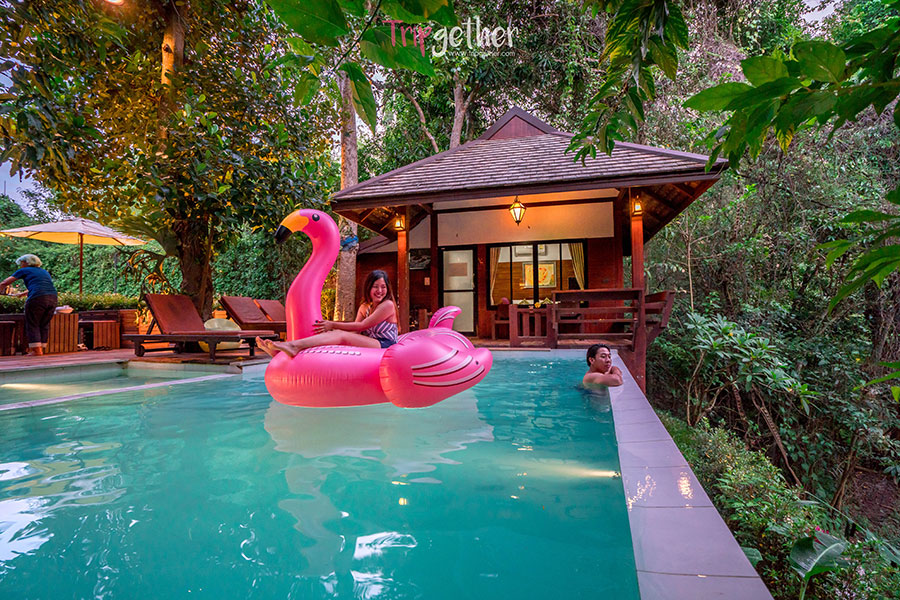 ห้องแรกที่จะพาไปชมบรรยากาศ เป็นที่พักสไตล์วิลล่าสุดส่วนตัว ตั้งอยู่ริมสระว่ายน้ำ ซึ่งเป็นสระว่ายน้ำส่วนกลางเปิดตั้งแต่ 8.30-17.00 น. และหลังจากเวลาดังกล่าวจะเป็นพื้นที่ส่วนตัวสำหรับลูกค้าที่จองบ้านหลังนี้ แต่ถ้าต้องการใช้แบบส่วนตัวแบบยาวๆ สามารถแจ้งทางที่พักได้เพื่อให้ปิดเป็นพื้นที่ Private มีค่าใช้จ่ายเพิ่มเติมเพียง 600 บาท (หากพักวันธรรมดาไม่มีค่าใช้จ่าย)
