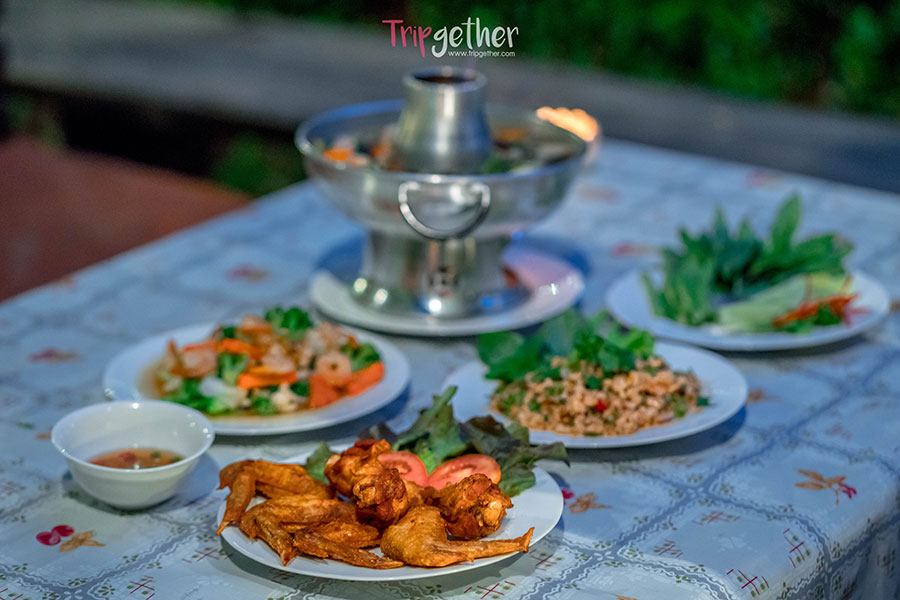 หากในช่วงเย็นไม่อยากออกไปไหนทางรีสอร์ทก็มีอาหารเย็นให้บริการ โดยมีเมนูแนะนำเป็น ลาบหมู, ต้มจืดเต้าหู้สาหร่าย, ไก่ทอด, ผัดผักรวม, ผัดกระเพรา หรือถ้าใครอยากกินหมูกระทะก็มีให้สั่งเช่นกัน โดยจะรับออเดอร์ตั้งแต่ 12.00-18.00 น.