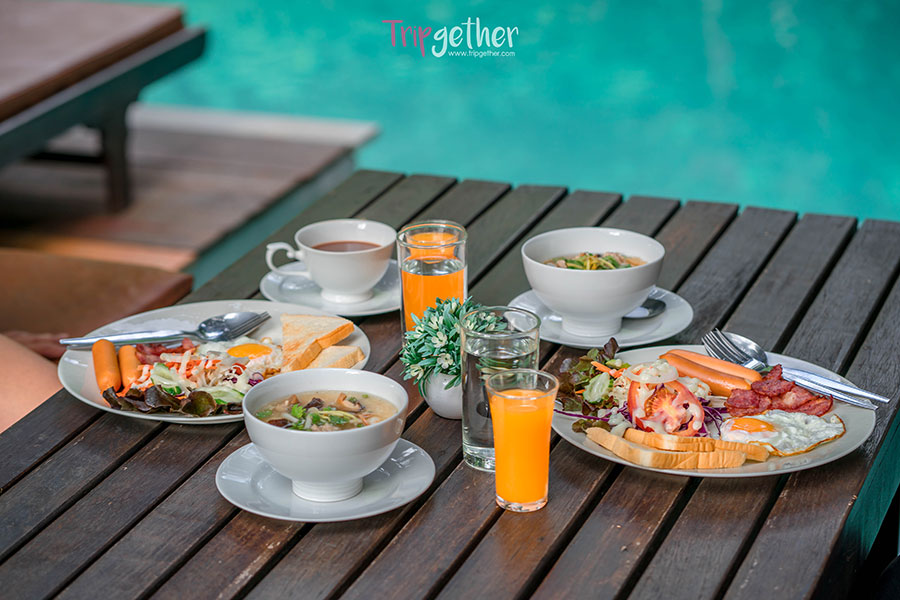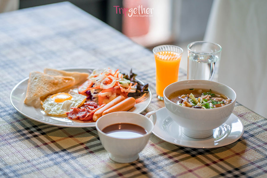 ในช่วงเช้าก็มีอาหารให้รับประทานกันในแบบเซ็ตเมนูอย่าง ข้าวต้ม และอเมริกันเบรคฟาสต์พร้อมน้ำผลไม้