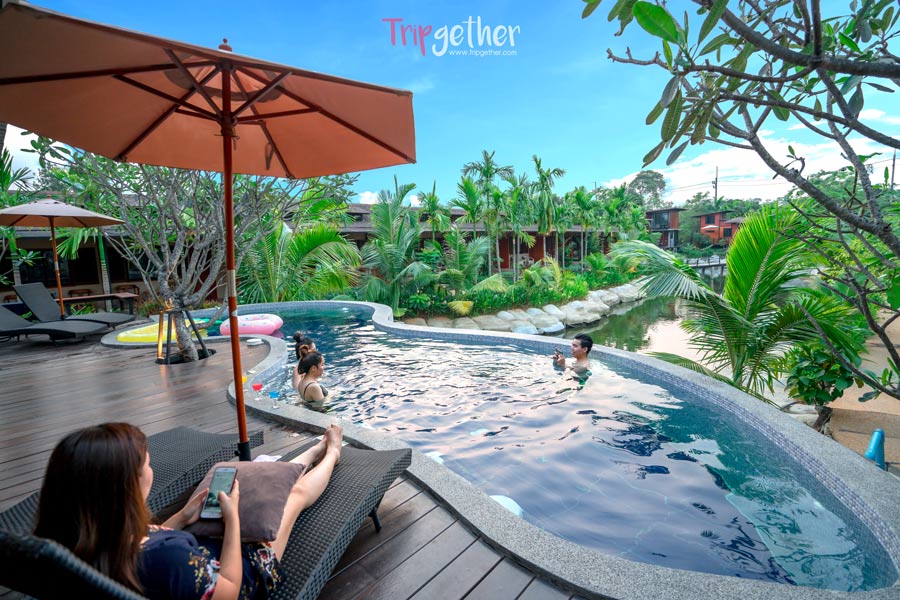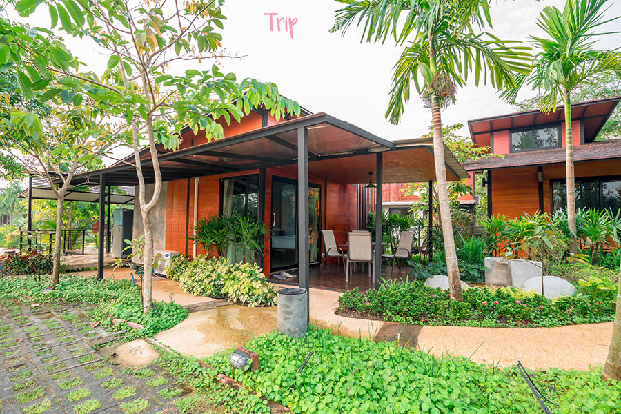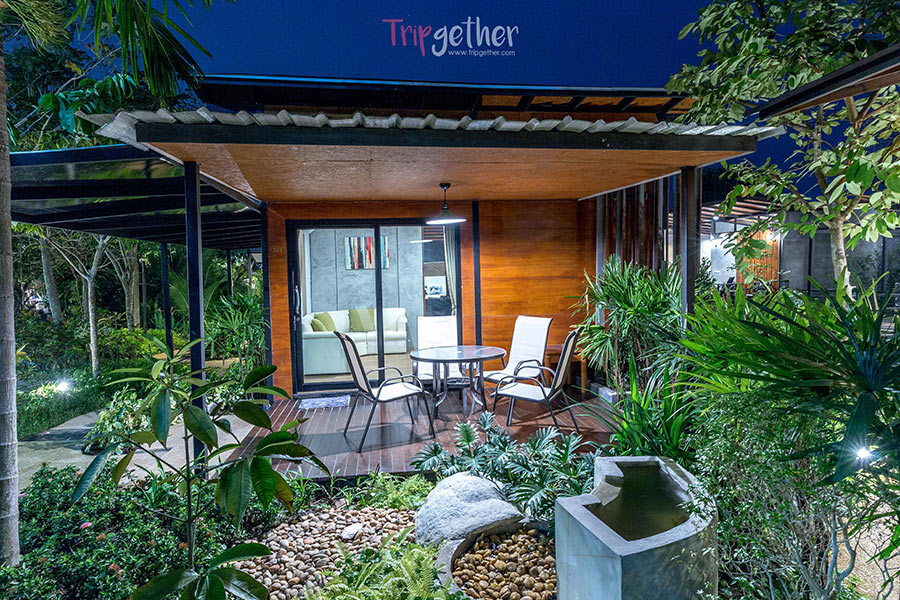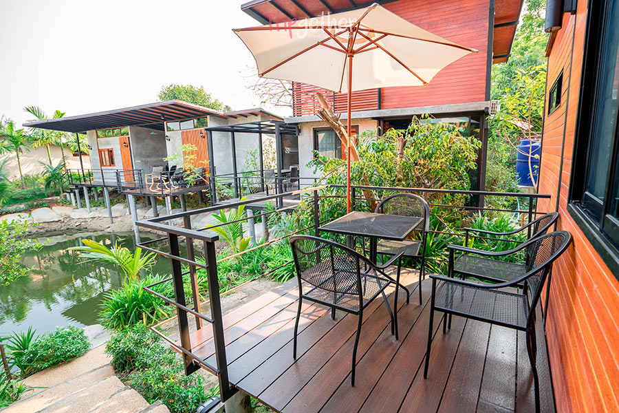 อีกทั้งด้านนอกยังมีระเบียงส่วนตัวให้พักผ่อนริมสระน้ำธรรมชาติ