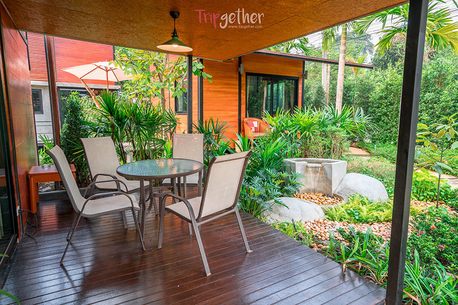 เดินข้ามสะพานมาอีกนิดจะเป็นห้อง Garden ห้องพักวิวสวนบรรยากาศร่มรื่น บริเวณด้านหน้าห้องพักจะมีสวนน้ำตกเล็กๆ พร้อมมุมนั่งพักผ่อนสบายๆ มีลมเย็นๆ พัดมาให้คุณได้รู้สึกชิลล์จนอยากนั่งอยู่ตรงนี้นานๆ
