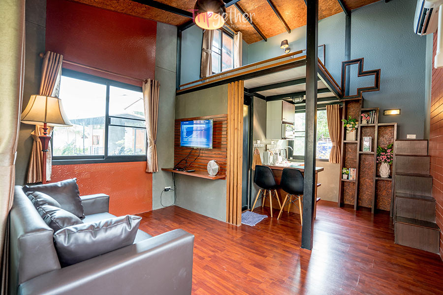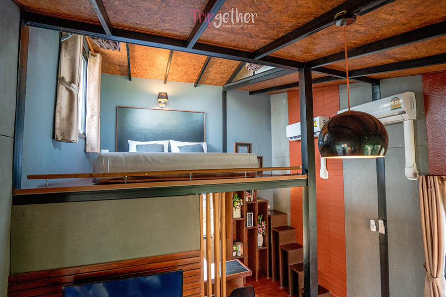 ห้องสุดท้าย Signature ห้องพักสุดเก๋ไก๋แบบชั้นครึ่ง บริเวณชั้นล่างจะมีห้องนั่งเล่น ห้องครัว และมุมหนังสือ