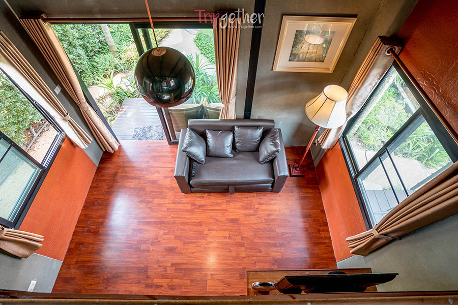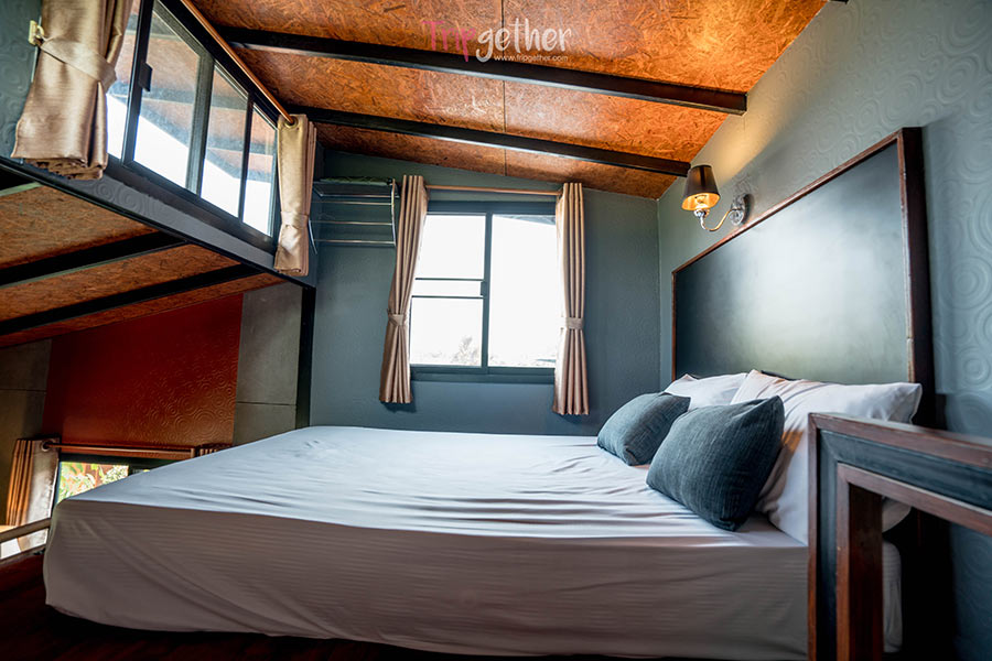 ส่วนบริเวณชั้นบนจะเป็นห้องนอนใต้หลังคา ตกแต่งด้วยกระจกบานใหญ่เพื่อให้คุณได้ชมวิวบ้านพักและสวนได้แบบสบายตา หรือช่วงดึกจะมองแสงดาวยามค่ำคืนก็โรแมนติกไปอีกแบบ เป็นอีกห้องที่เหมาะสำหรับคู่รักที่อยากชวนกันมาสวีท