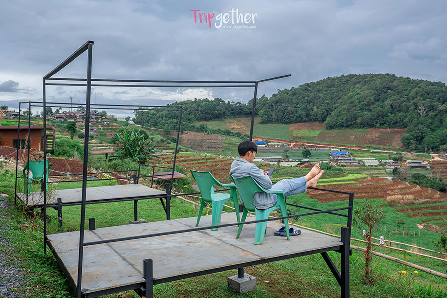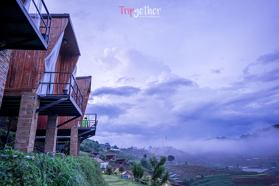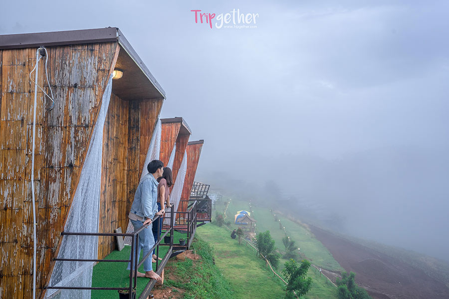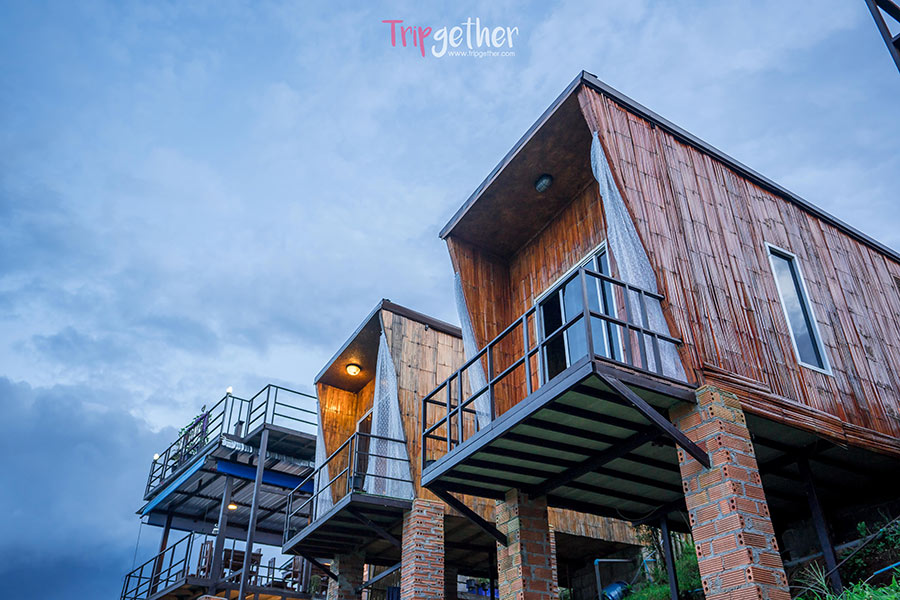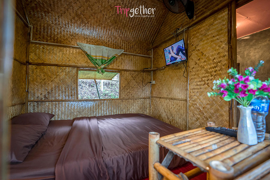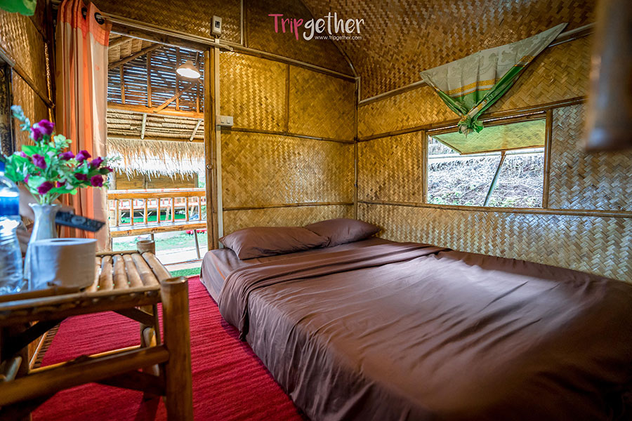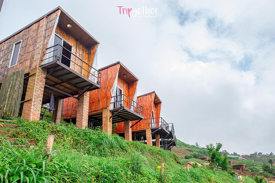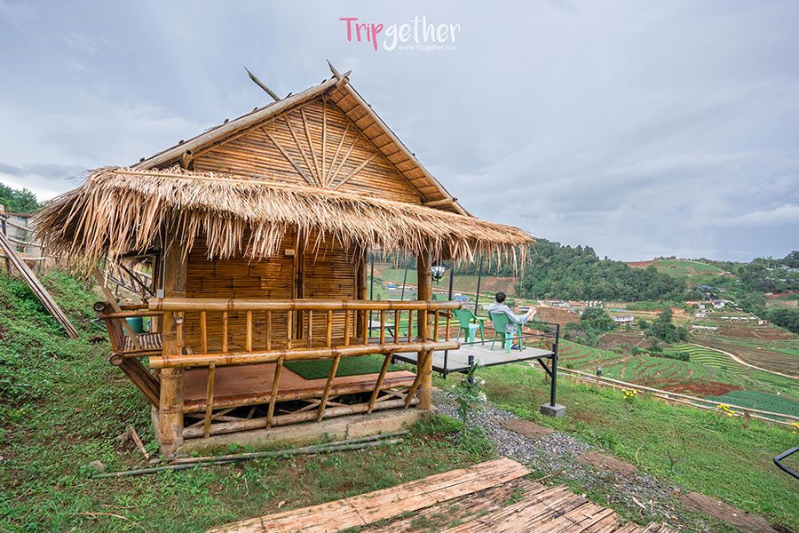 จากบ้านกล่องเดินลงเนินเขามาไม่ไกลจะเป็นโซนที่พัก บ้านไม้ไผ่ ที่ถึงแม้จะตั้งอยู่พื้นที่ด้านล่าง แต่จากมุมนี้ก็สามารถชมวิวของขุนเขาได้สวยงามไม้แพ้มุมจากด้านบน แถมบ้านพักยังมีมุมพักผ่อนที่จัดไว้แบบส่วนตัวให้คุณได้มานั่งเล่น หรือจะสั่งหมูกระทะมาปิ้งย่างที่มุมนี้ก็อร่อยเด็ดอย่างแน่นอน