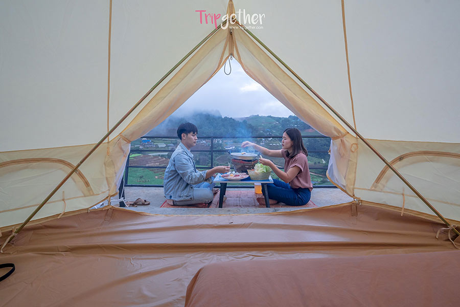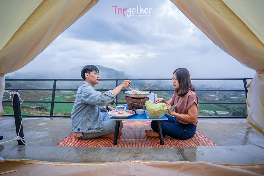 สั่งหมูกระทะมานั่งกินหน้าเต็นท์นอนพร้อมชมวิวขุนเขาและสายหมอกชิลล์สุดๆ ไปเลย
