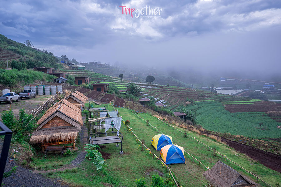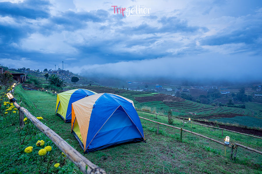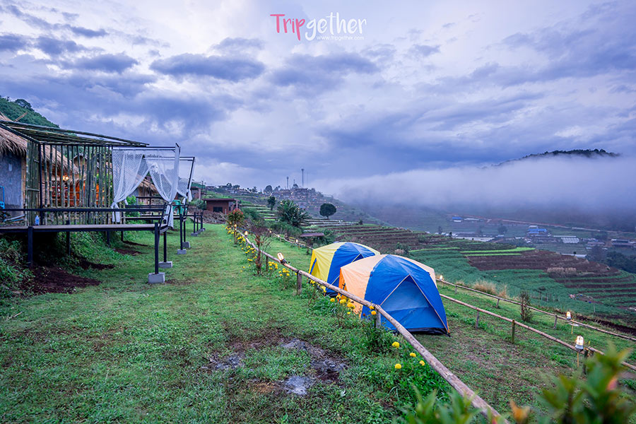 และในบริเวณใกล้ๆ กับบ้านไม้ไผ่จะเป็นลานกางเต็นท์ มีเต็นท์ของทางโฮมสเตย์ที่ได้จัดเตรียมไว้ให้ พร้อมชุดเครื่องนอนอย่างดี ส่วนห้องน้ำจะแยกชายและหญิง ตั้งอยู่ไม่ไกลจากเต็นท์สามารถเดินได้แบบไม่เหนื่อย