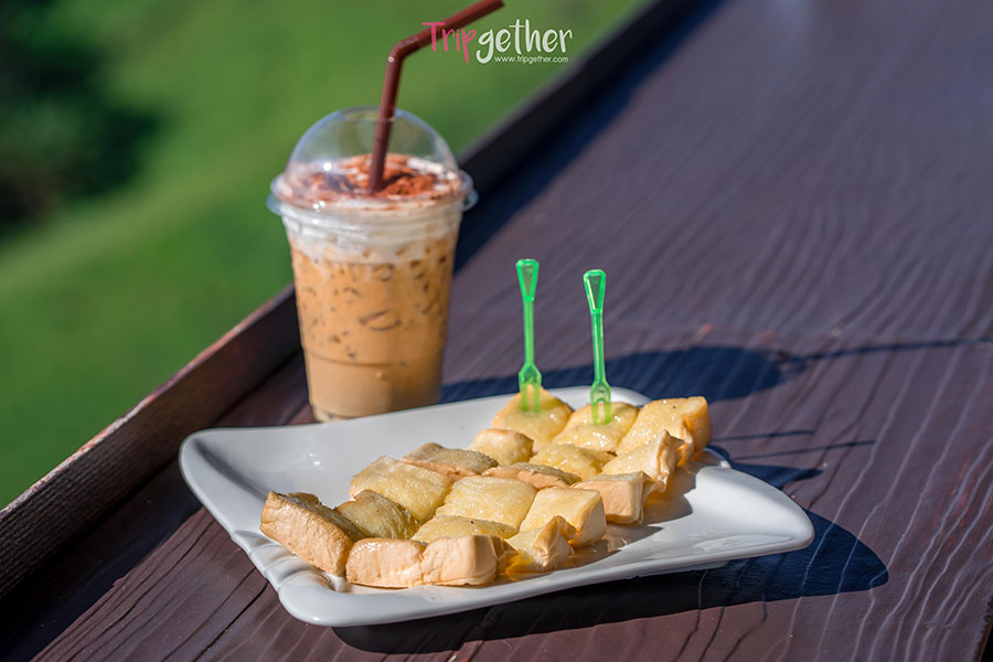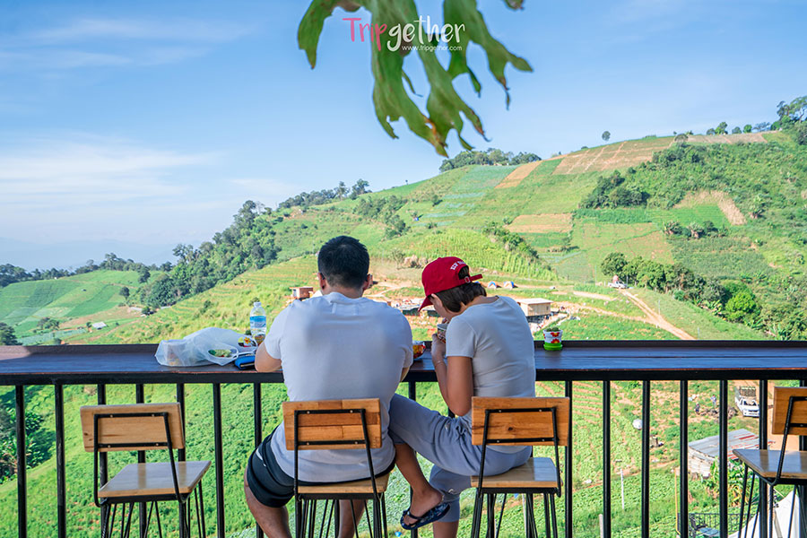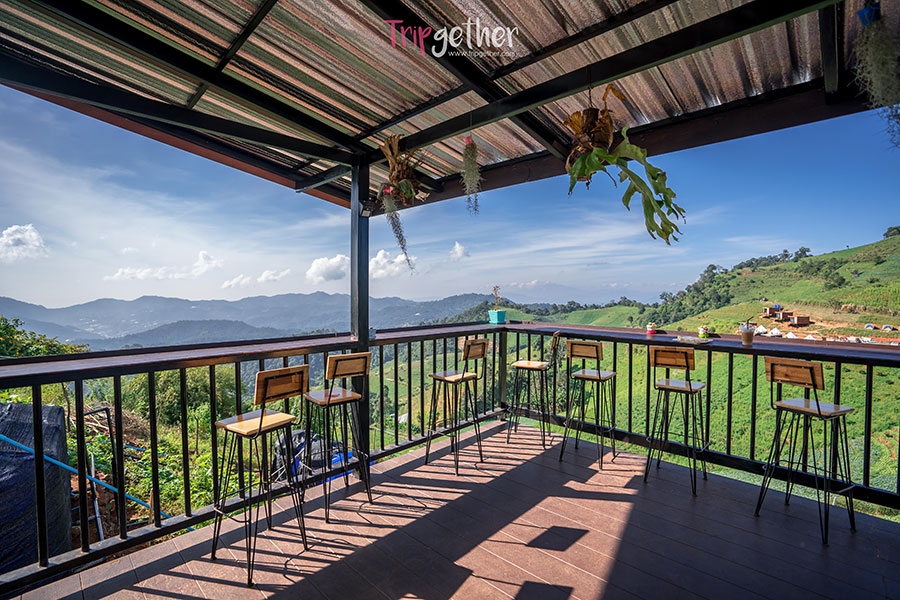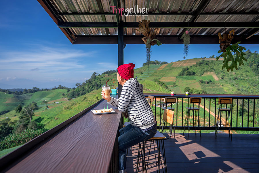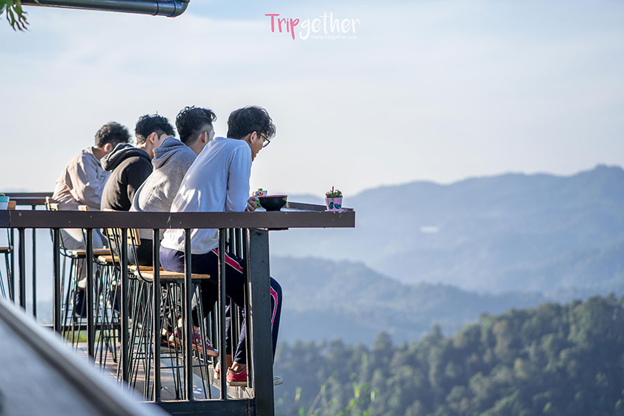 หากใครตื่นไม่ทันที่นี่ก็มีห้องอาหารและร้านคาเฟ่เปิดให้บริการตลอดทั้งวัน แถมยังมีมุมเทอเรสที่ยื่นออกไปบนเขาให้เราได้นั่งห้อยขาดูวิว จิบกาแฟกันได้แบบเพลินๆ