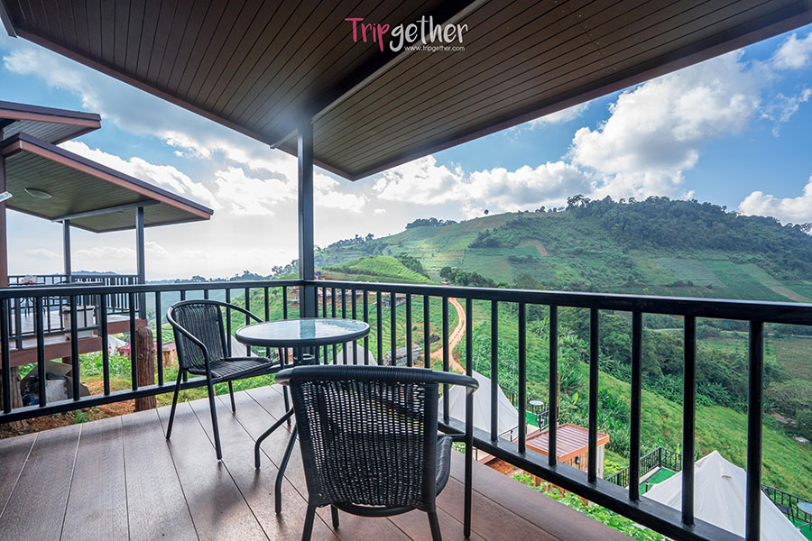 บริเวณด้านหน้าเต็นท์กระโจมยังมีพื้นที่ระเบียงเล็กๆ ให้คุณได้ออกมาสูดอากาศดีๆ หรือจะนั่งชิลล์ที่มุมนี้ก็รับรองได้ฟีลลิ่งการพักผ่อนแบบเต็มที่ หากยังไม่หนำใจช่วงเย็นใครอยากจะสั่งอาหารมารับประทานที่หน้าเต็นท์ก็สามารถแจ้งกับทางพนักงานได้เลย