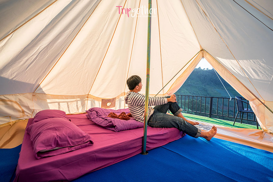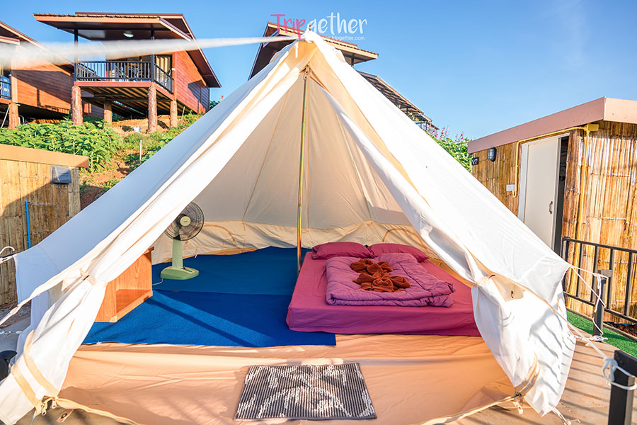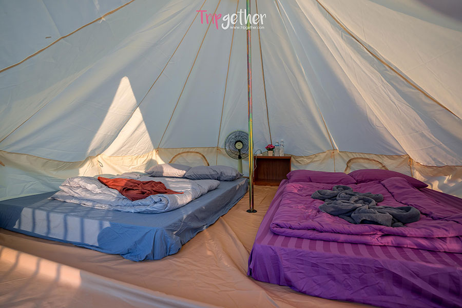 สำหรับเต็นท์นอนก็ครบครันด้วยสิ่งอำนวยความสะดวกสบายไม่แพ้กับห้องพัก มาพร้อมด้วยที่นอนนุ่มๆ แถมยังมีให้เลือกพัก ทั้งแบบเต็นท์สำหรับคู่รักพักได้ 2 คน