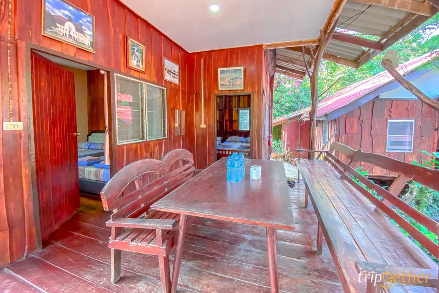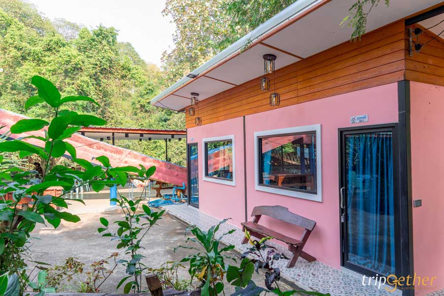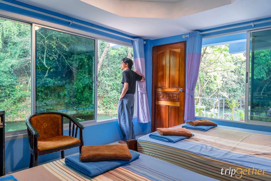 หนึ่งในบ้านพักที่ให้ฟีลธรรมชาติแบบเต็มร้อย! คือ บ้านริมธาร บ้านไม้หลังเล็กๆ ติดริมน้ำ ท่ามกลางป่าเขา แค่เปิดประตูก็ได้เจอวิวแม่น้ำที่ทอดยาว สูดอากาศบริสุทธิ์ได้แบบเต็มปอด ภายในบ้านริมธารมี 1 ห้องนอน 2 เตียงใหญ่ เหมาะสำหรับครอบครัวเล็กหรือกลุ่มเพื่อนซี้ พร้อมห้องน้ำในตัว เครื่องทำน้ำอุ่น และสิ่งอำนวยความสะดวกครบ หน้าบ้านมีโต๊ะเก้าอี้ให้นั่งห้อยขา มองสายน้ำไหลผ่าน เป็นความสุขเรียบง่ายที่หาไม่ได้จากเมืองใหญ่