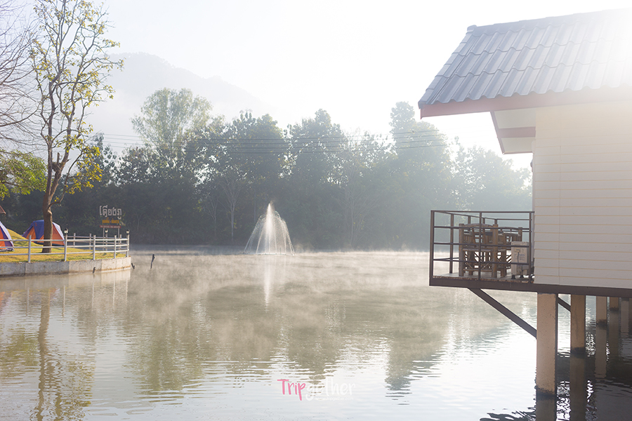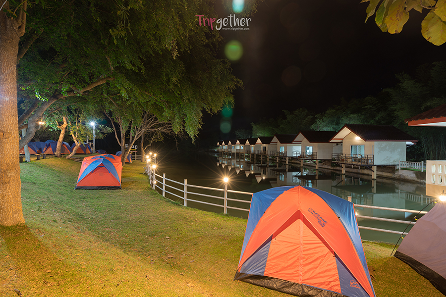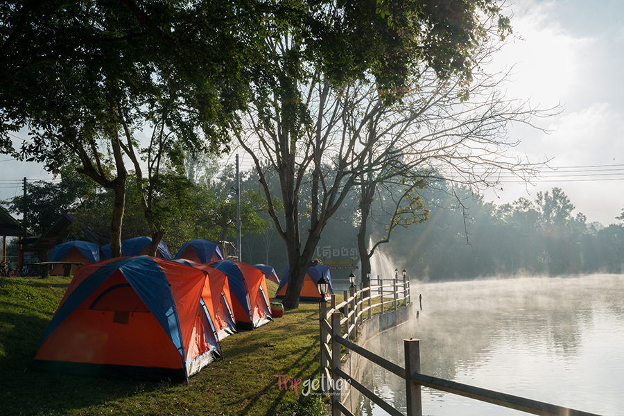 ต่อมาในส่วนจุดกางเต้นท์ ที่นี่มีเต้นท์และเครื่องนอนพร้อมให้บริการ หรือหากนำเต้นท์มากางเองเพียงแค่เสียค่าพื้นที่ก็สามารถกางเต้นท์ได้แล้ว เชื่อว่าใครที่ชอบสัมผัสอากาศหนาวๆ แบบไม่มีปูนและกระจกมากั้นน่าจะชอบโซนนี้เป็นพิเศษ เพราะช่วงกลางคืน นอกจากจะได้ทำอาหารปิ้งย่างและสังสรรค์กันเล็กๆน้อยๆแล้ว ยังมีไอหมอกสีขาวนวลที่ลอยตัวอยู่เหนือทะเลสาบลอยขึ้นมาเพิ่มบรรยากาศให้ดูอีกต่างหาก แถมไม่ต้องห่วงเรื่องอุปกรณ์ทำครัว เพราะที่นี่มีให้บริการเช่นกัน