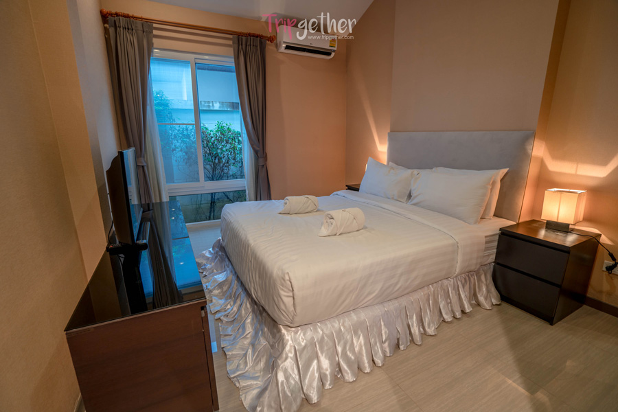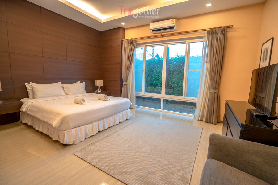 และในส่วนของห้องนอนจะมีทั้งหมด 3 ห้องนอน 3 ห้องน้ำ เมื่อเดินเข้าไปจะเห็นห้องแรกด้านขวามือเป็นห้องพักที่มีพื้นที่กว้างขวาง มีเตียงนอน King Size ไว้ให้เราได้นอนกลิ้งกันเต็มที่ อีกทั้งยังมีสิ่งอำนวยความสะดวกอย่างดีอีกมากมาย ที่รับรองจะทำให้คุณไม่อยากลุกออกไปไหนอย่างแน่นอน