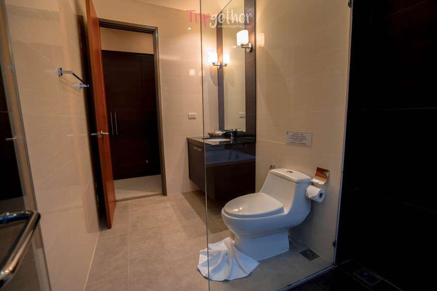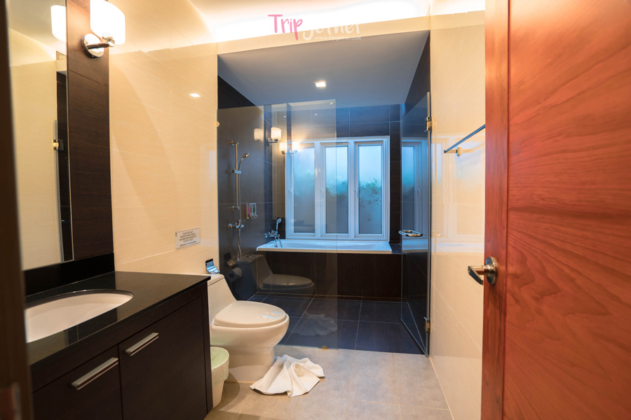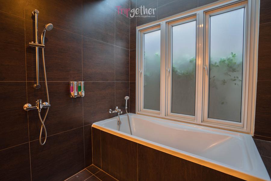 ในส่วนของห้องน้ำที่นี่ก็เลือกใช้ชุดสุขภัณฑ์อย่างดี มีระบบน้ำร้อนน้ำเย็น เรนชาวเวอร์ (Rain Shower) และอ่างจากุชชี่ให้คุณได้นอนแช่ตัวกันแบบเพลินๆ