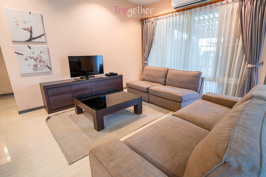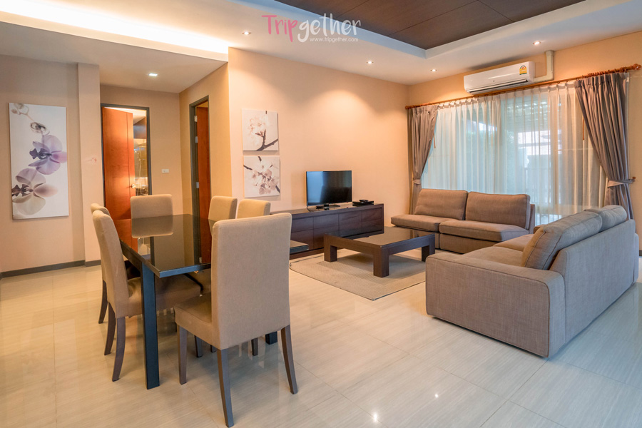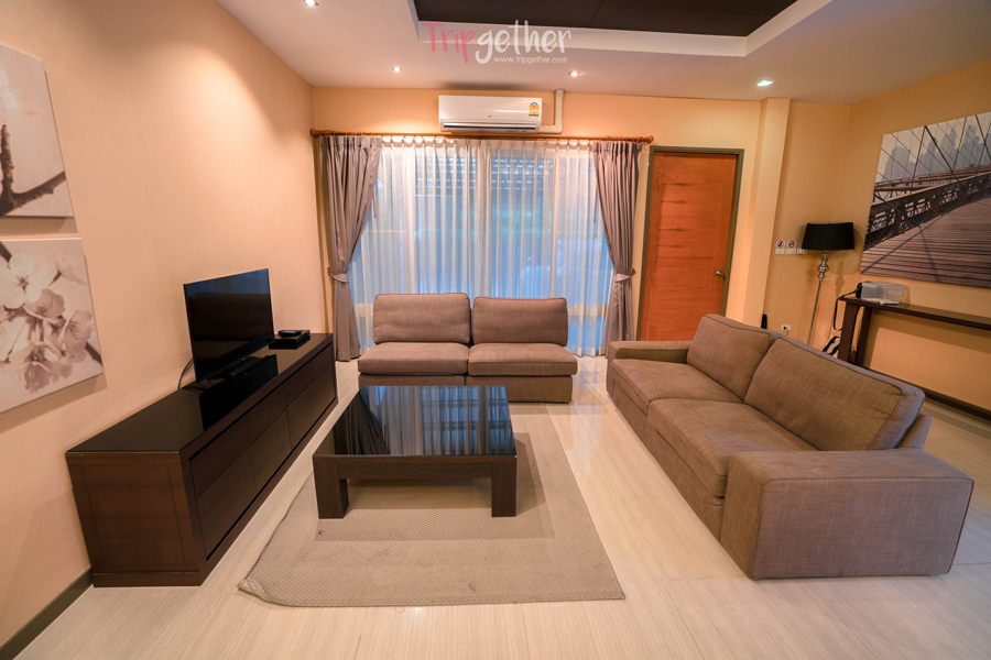 เมื่อเข้ามาภายใน้บ้านจะเป็นนการตกแต่งในสไตล์โมเดิร์นร่วมสมัย หรูหรา มีพื้นที่กว้างขวางและกระจกบานใหญ่ที่ให้ความรู้สึกโปร่งสบาย มีห้องนั่งเล่นพร้อมโซฟาขนาดใหญ่ โทรทัศน์ ช่องเคเบิ้ล และสิ่งอำนวยความสะดวกอีกเพียบในพื้นที่ส่วนกลางไว้ให้คุณได้ชิทแชทกันถึงวันวาน