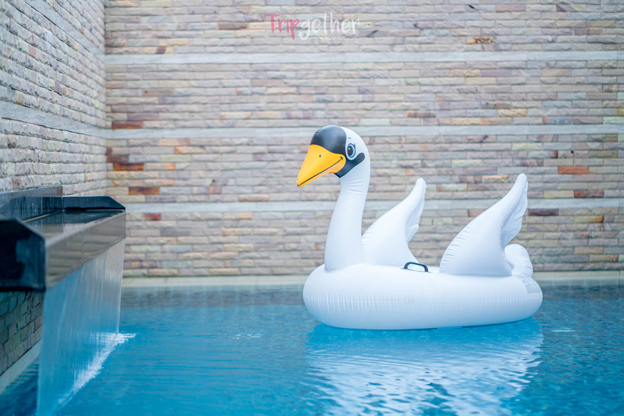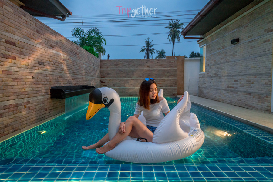 เมื่อเข้ามาบริเวณบ้านพักจะเห็นสระว่ายน้ำเป็นอันดับแรก เพราะตั้งอยู่บริเวณข้างบ้านแถมยังมีขนาดใหญ่มากๆ พอให้ปาร์ตี้กันหลายคนทีเดียว