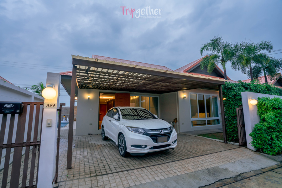 ส่วนบริเวณด้านหน้าบ้านพักจะเป็นลานจอดรถส่วนตัว สามารถจอดได้ 2 คัน หากมีรถมาเยอะกว่านี้ก็สามารถจอดเทียบหน้าบ้าน ซึ่งเป็นถนนขนาดใหญ่ไม่กีดขวางการจราจรแน่นอน