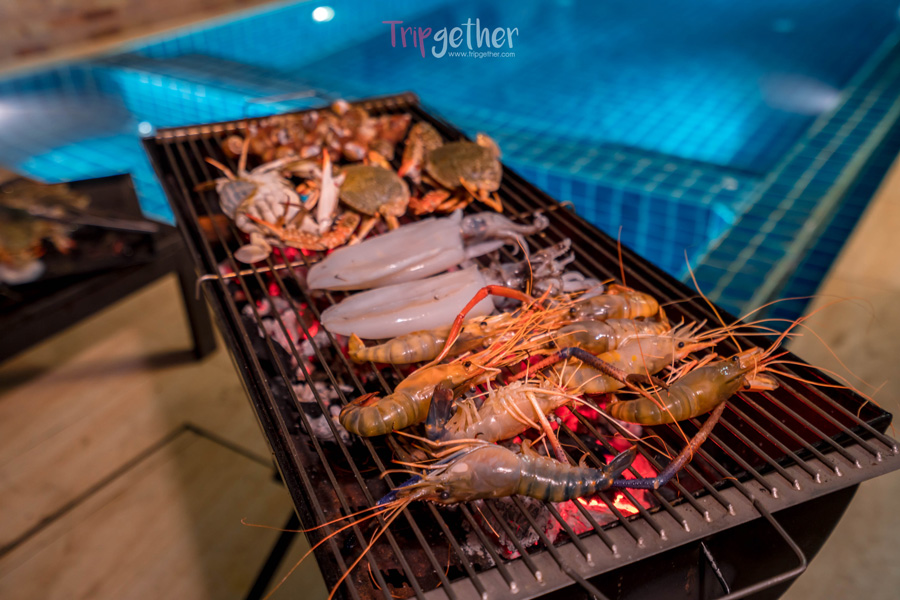 ช่วงเย็นทางที่พักยังมีบริการเช็ตอาหารไว้ให้คุณได้ปาร์ตี้ริมสระไปกับเมนูบาร์บีคิวซีฟู้ดทั้งกุ้ง ปู ปลาหมึก และหอยหวาน โดยทางที่พักจะเป็นผู้จัดการเรื่องเตาปิ้งย่างไว้ให้อย่างพร้อมสรรพ หรือสามารถซื้อของสดจากตลาดข้างนอกเข้ามาเพิ่มไว้ปาร์ตี้กันยาวๆ