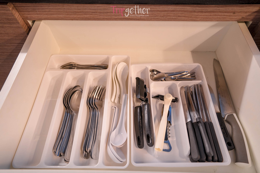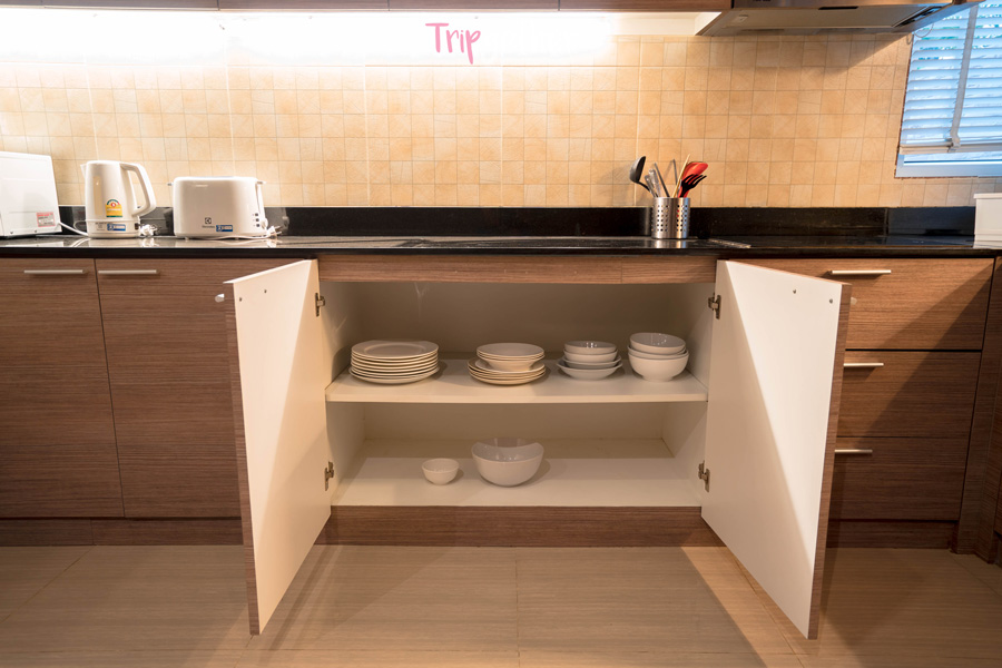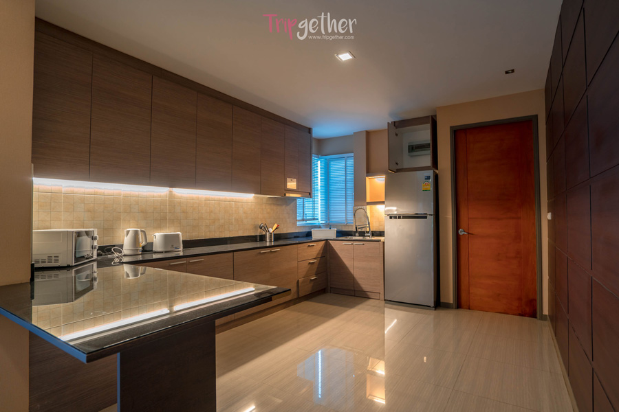 ถัดไปอีกนิดจะเป็นมุมห้องครัวซึ่งมีพื้นที่กว้างขวางไม่แพ้กัน พร้อมทั้งยังมีอุปกรณ์ทำครัวและของใช้อย่างมากมาย ไม่ว่าจะเป็นตู้เย็นไซส์ใหญ่ไว้เก็บของสดสำหรับปาร์ตี้ในช่วงค่ำพร้อมน้ำดื่ม เตาไฟฟ้า กาน้ำ ไมโคเวฟ รวมไปถึงแก้ว ถ้วย ชาม ช้อนส้อมต่างๆ ที่มีอย่างครบครันอยู่ในชั้นวางของ รวมถึงเครื่องซักผ้าที่มีระบบอบผ้าในตัว