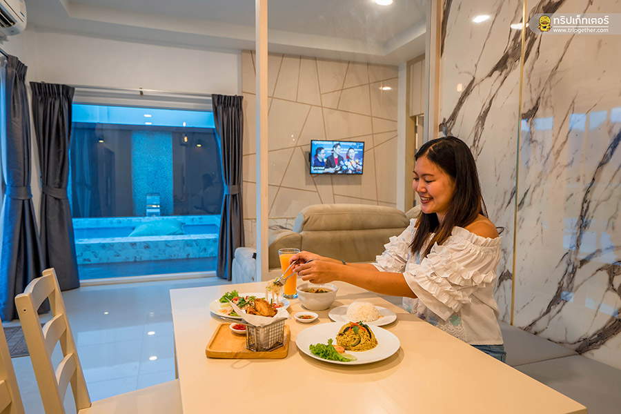 เดอะวิสต้า พูลวิลล่า ยังมาพร้อมกับการบริการเสิร์ฟอาหารถึงห้องพัก ให้คุณได้พักผ่อนกันอย่างแท้จริงด้วยการพักผ่อนที่เหนือระดับ พร้อมกับการรับประทานอาหารริมสระว่ายน้ำสุดไพรเวท โดยเมนูอาหารของที่นี่ก็มีให้เลือกสั่งกันเพียบ ซึ่งเมนูที่สั่งมาวันนี้มีทั้ง แกงป่าทะเล ข้าวผัดเขียวหวานหมู ปีกไก่ทอด และยำวุ้นเส้นหมูสับ