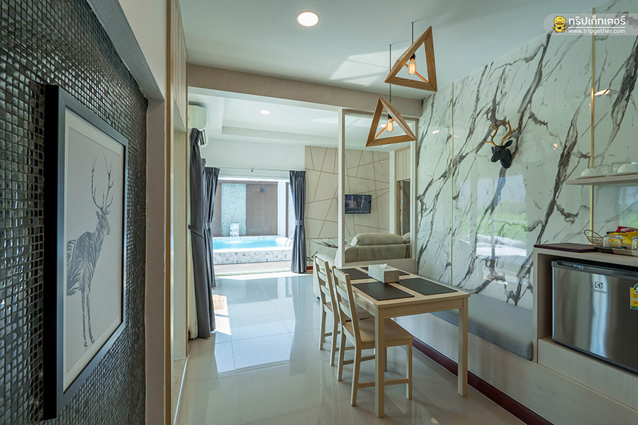 ภายในห้องพักตกแต่งได้อย่างหรูหราในสไตล์โมเดิร์น แบ่งโซนพักผ่อนได้อย่างลงตัวมีทั้งห้องนั่งเล่น ห้องนอน มุมพักผ่อนต่างๆ ภายในพื้นที่ของห้องพักให้คุณได้รีแลกซ์ และโดดน้ำลงสระหน้าห้องพักได้อย่างส่วนตัว