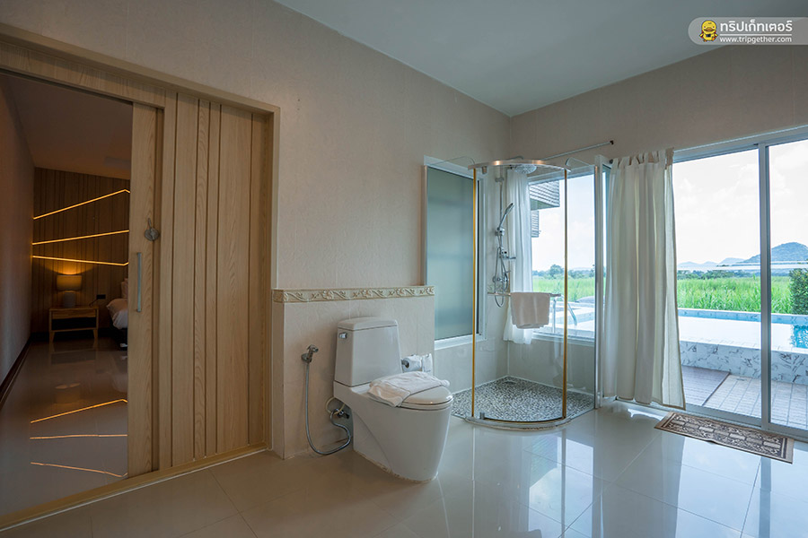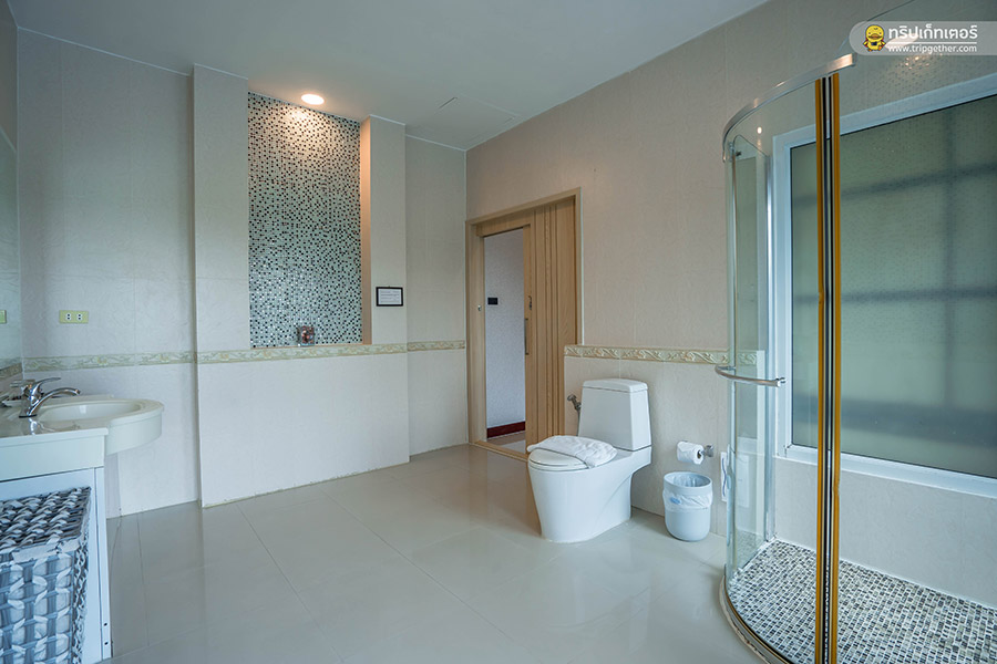 อีกทั้งยังมี 2 ห้องน้ำที่สามารถรองรับกับกลุ่มใหญ่ได้อย่างดี ภายในห้องน้ำตกแต่งได้อย่างหรูหราตามคอนเซ็ปต์ และยังเลือกใช้ชุดสุขภัณฑ์อย่างดี เพียบพร้อมด้วยสิ่งอำนวยความสะดวกครบครัน