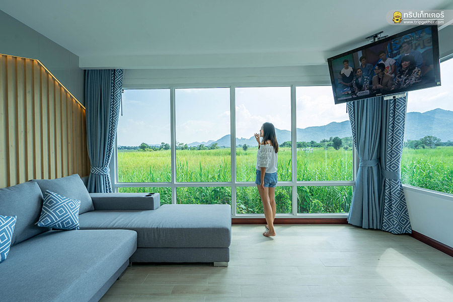 ห้องนั่งเล่นจะนั่งดูทีวีชิลล์ๆ หรือชมวิวผ่านกระจกบานใหญ่ก็ชิลล์ไปอีกแบบ
