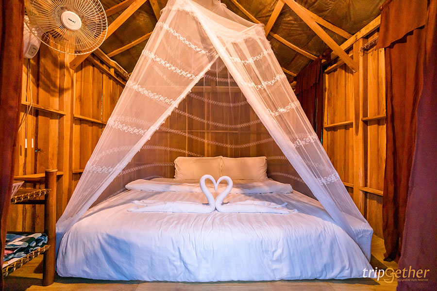 มาเริ่มกันที่ที่พักแบบ บ้านเรือนไม้สัก มีทั้งหมด 2 หลัง ภายในที่พักมีทั้งหมด 2 ห้องนอน ตกแต่งเรียบง่ายเป็นไม้ทั้งหลัง ห้องนอนใหญ่ กว้างขวางมาก มี 2 เตียงนอน ที่ออกแบบและแบ่งสัดส่วนได้เป็นอย่างดี พร้อมกับโต๊ะเครื่องแป้งและสิ่งอำนวยความสะดวกครบครัน