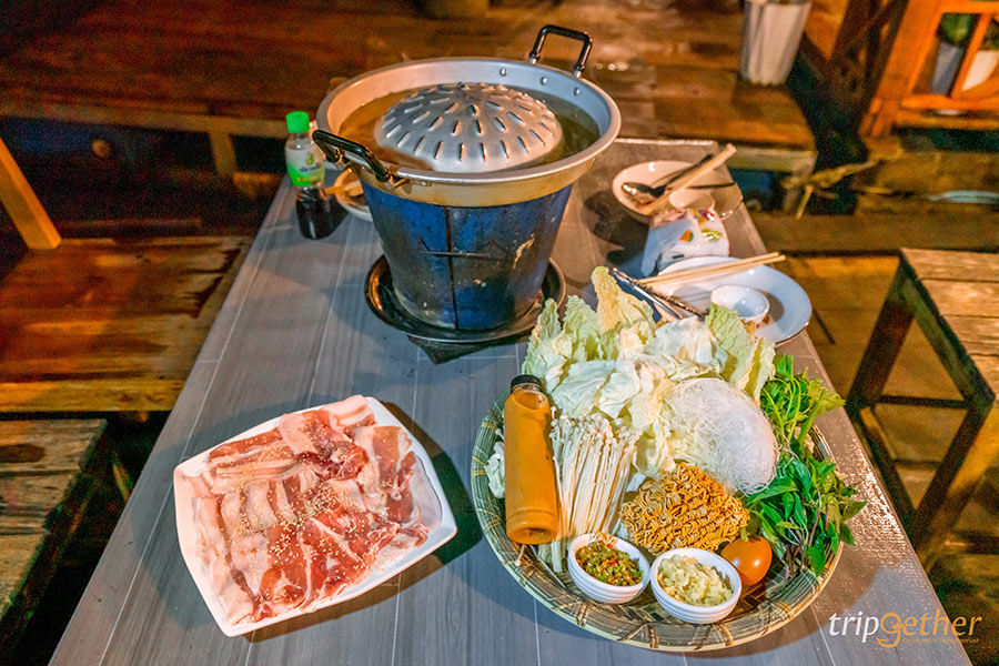 สำหรับอาหารเย็นก็มีให้บริการเป็นอาหารตามสั่งและหมูกระทะอีกด้วย สั่งมากินริมน้ำได้แบบฟินๆ ชิลล์มาก ราคาเพียง 200,000 กีบ (ประมาณ 327 บาท) ใครมากับแก๊งค์เพื่อนห้ามพลาด